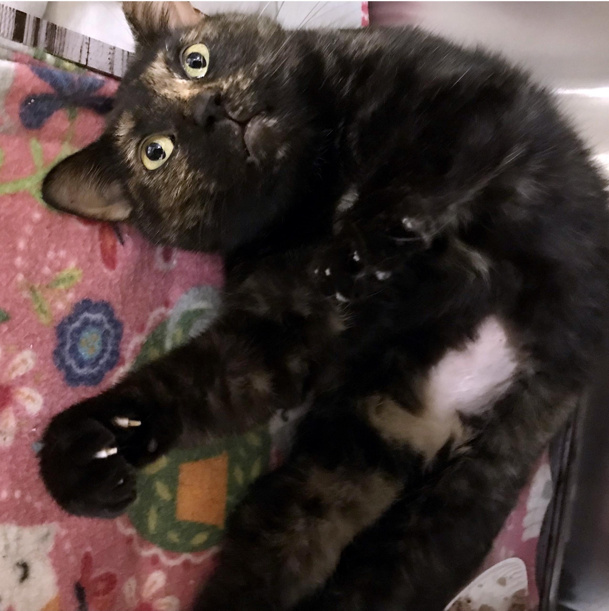 Snickers is a dark tortoiseshell female cat. She is a friendly girl who loves to be petted and will roll over in delight. She is vetted, spayed and litter trained.