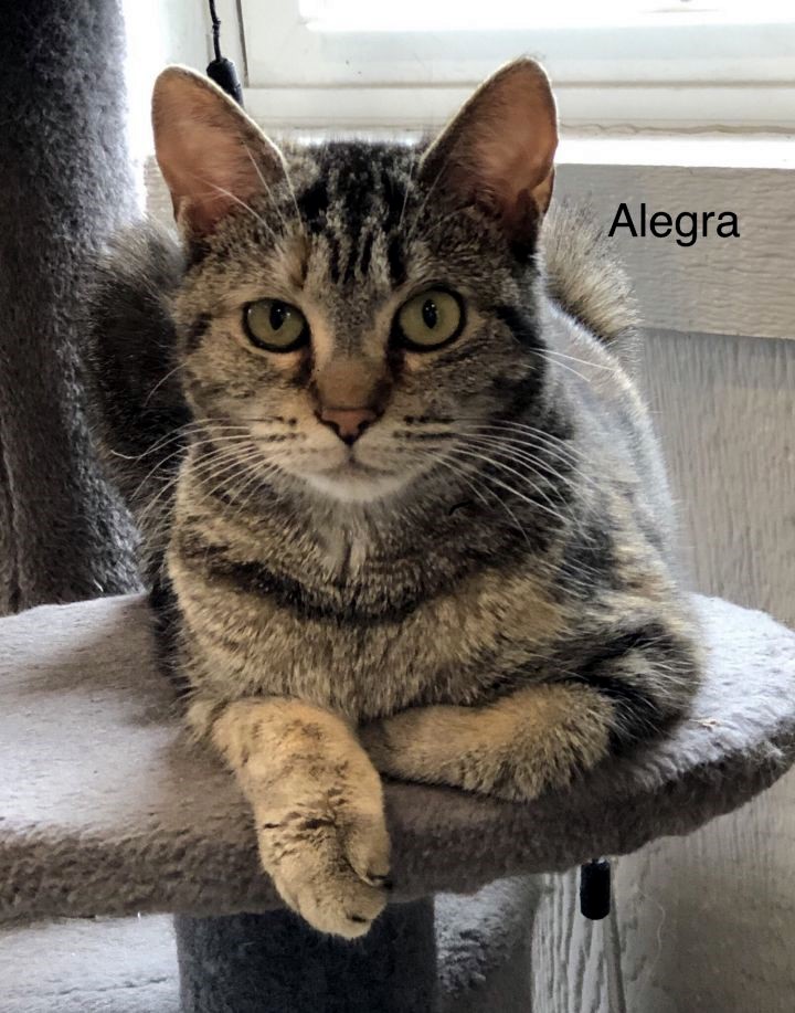 Alegra is a 6-month-old, spayed female dilute tortoiseshell. She is fully vetted and litter box trained. Alegra is a love cat who likes to sit in your lap and help you work. She gets along well with other cats and would make a great companion.