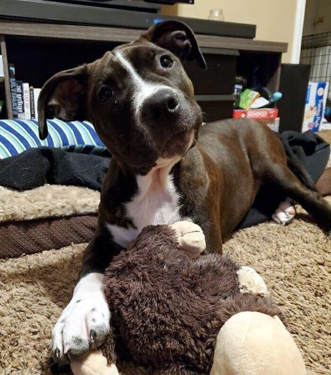 Tarzan is a 3-month-old male pit bull terrier mix. This puppy enjoys playing with other puppies and dogs. He is doing great with his house training. Tarzan gets along well with children.