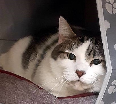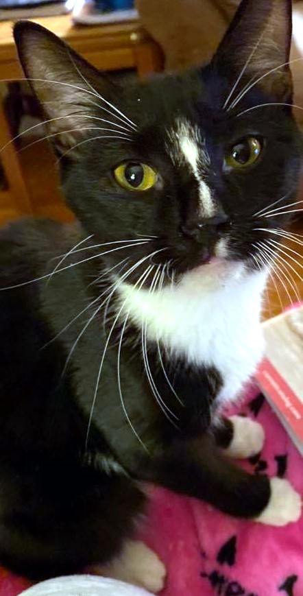 Binx is a pretty 4-year-old, spayed female domestic short hair. She is house trained and gets along well with children and dogs. She has only been observed with a male cat, but she might do fine with a female cat with careful introduction. Binx is very friendly and is a little lovebug. She loves to play and to cuddle.