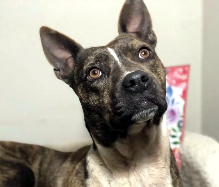 Shaggy is a 3-year-old, 40-pound, spayed female pit bull terrier with a beautiful brindle coat. She is fully vetted and house trained. Shaggy loves people and gets along well with other dogs, but is aggressive with her food and toys. This sweet girl would make a great companion.