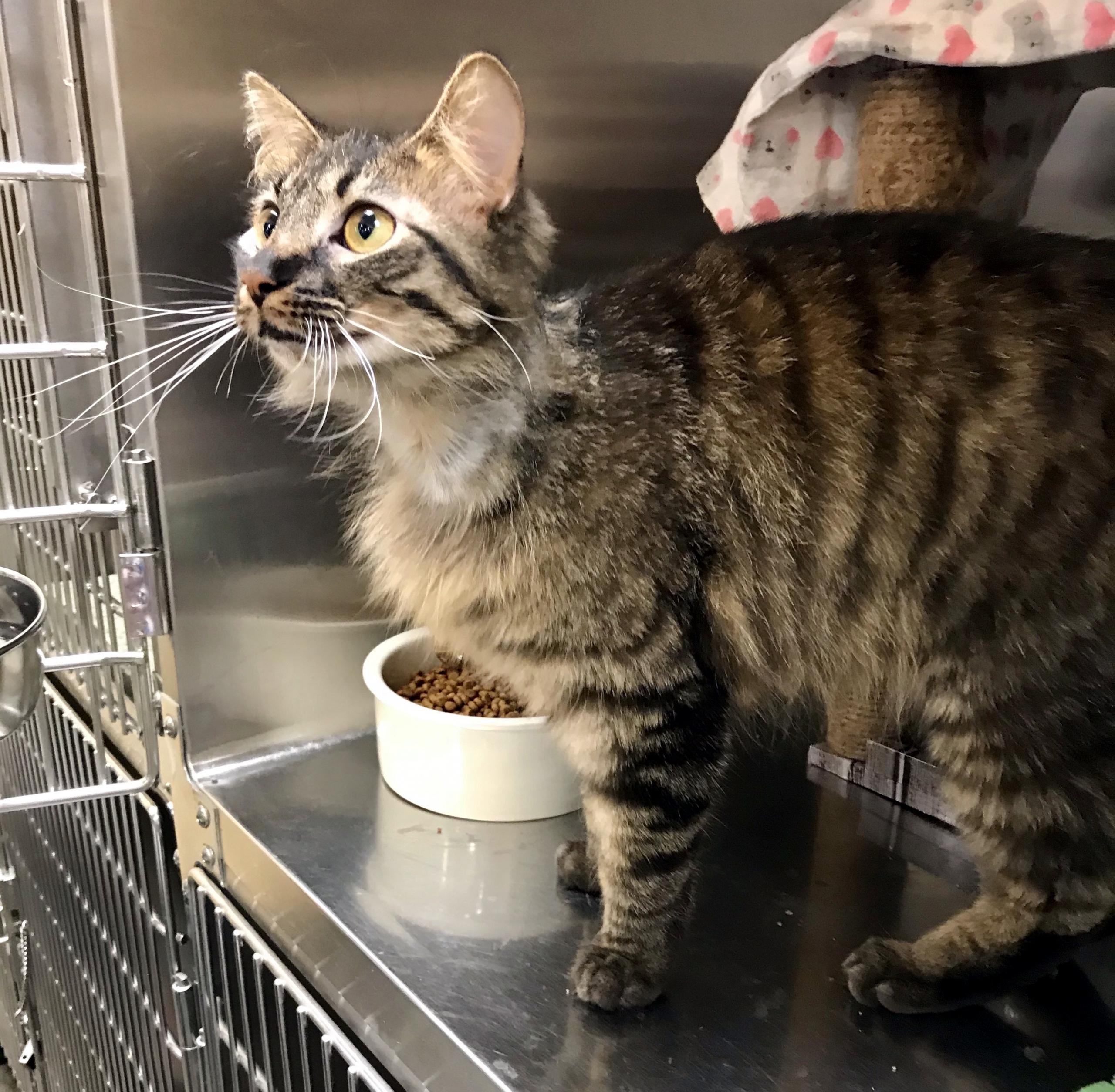 Miss Sissy is 1-2-year-old longhaired gray female tabby with very long whiskers. She is a sweet-natured friendly girl, who was surrendered from a sadly neglectful situation. She needed vet care with rehydration and good food, and has bounced back beautifully. She is playful and curious, and loves to be petted. Sissy is spayed, vetted, and litter trained.