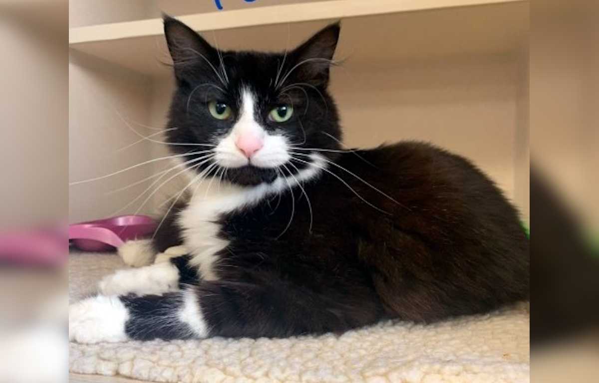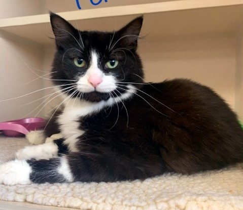Stonewall is a handsome 1-year-old neutered male domestic shorthair with unusual markings and mesmerizing green eyes. He is fully vetted and litter box trained. Stonewall is a friendly boy and would make and excellent companion.