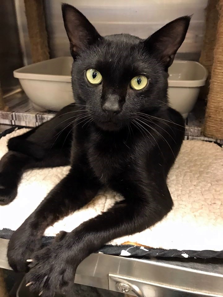 Zook is a 1-year-old all black shorthaired boy. Though a little shy in the cage setting, Zook does like people and comes forward to be petted. He is neutered, vetted, and litter trained. He is a beauty with his jet-black coat and green eyes.