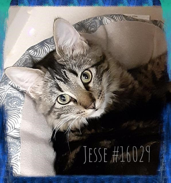 Jesse is an adorable striped female domestic long-haired kitten. She is very curious and loves to play.