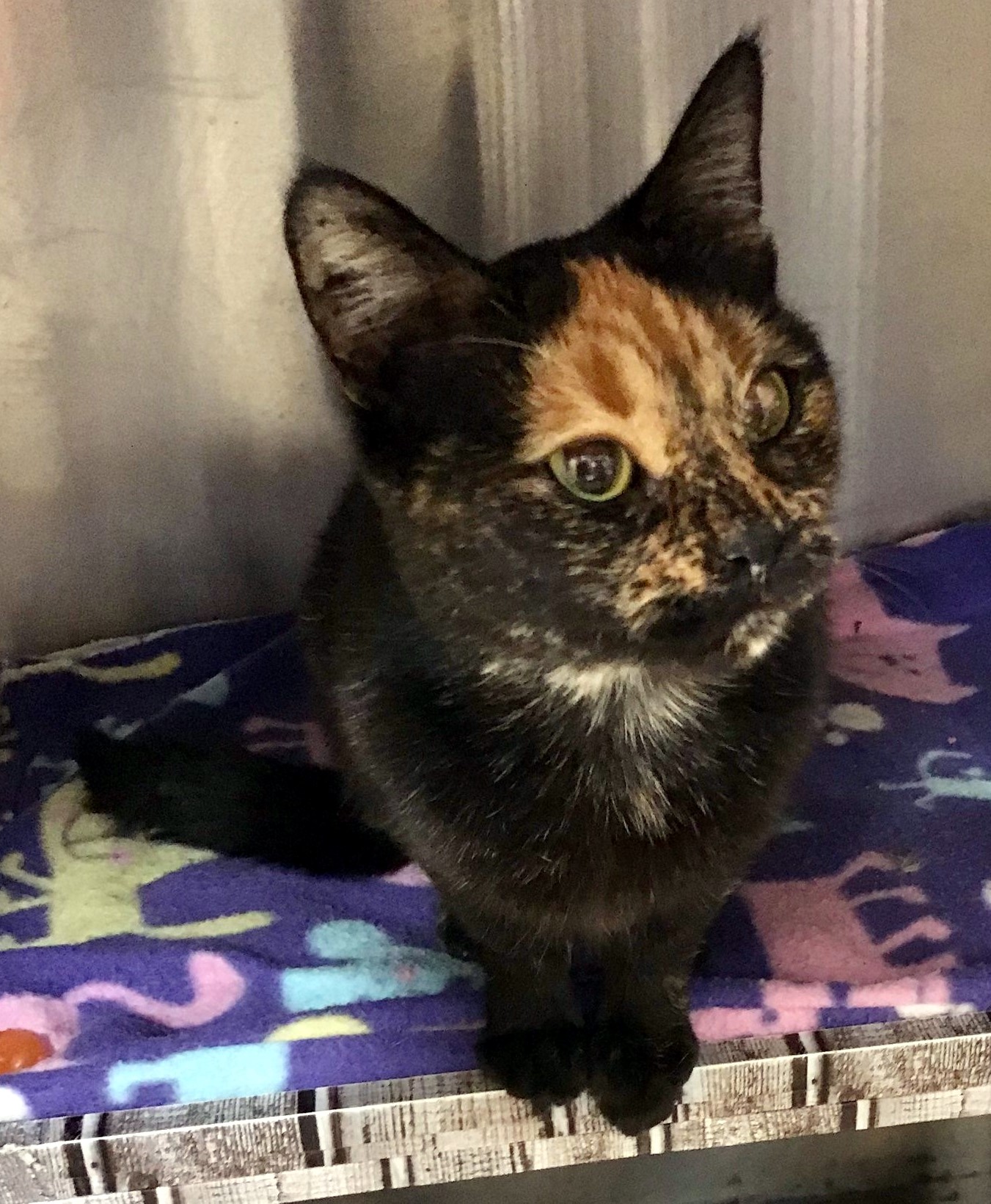 Mabel is a 3-year-old female shorthaired tortoiseshell with an autumn face. She is vetted, spayed, and litter trained. She is sweet and playful.