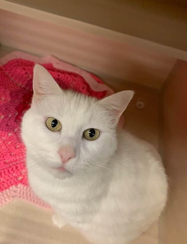 Buttermere is stunning all white adult female domestic medium hair. She has been at the shelter for over 3-month. Her front paws are declawed. Buttermere is vetted and litter box trained. She is a very sweet cat who likes to have her head rubbed. She may do best in a home without small children.