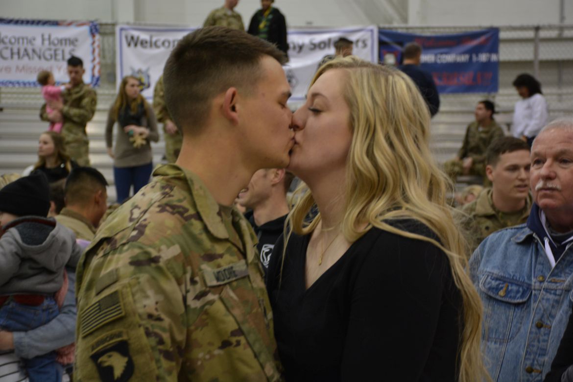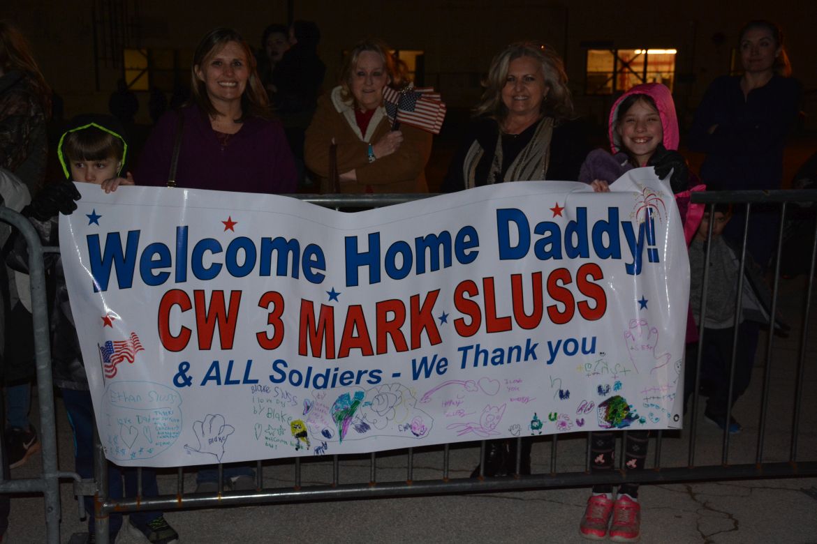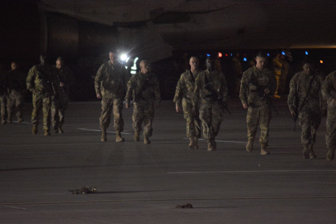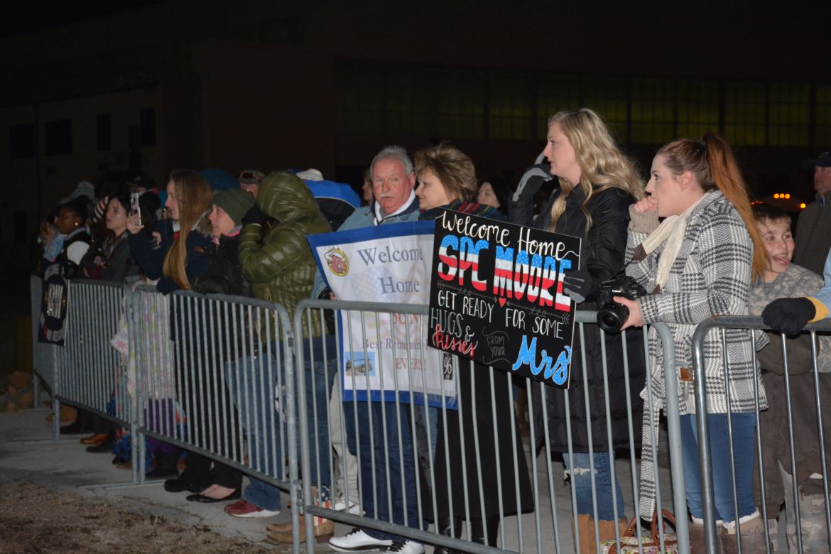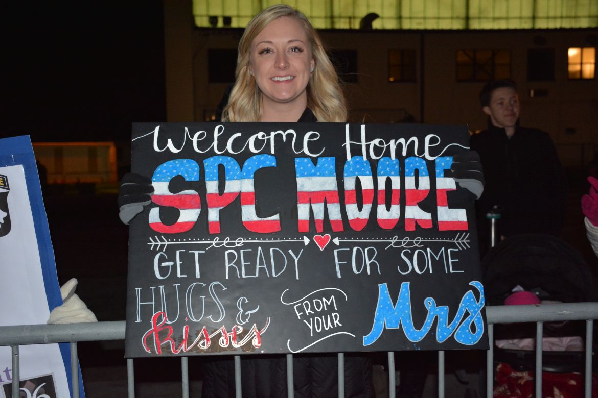 The soldiers were returning from a nine-month deployment to Afghanistan and marched into the hangar at the airfield for a Welcome Home Ceremony in their honor attended by family, friends and fellow soldiers.