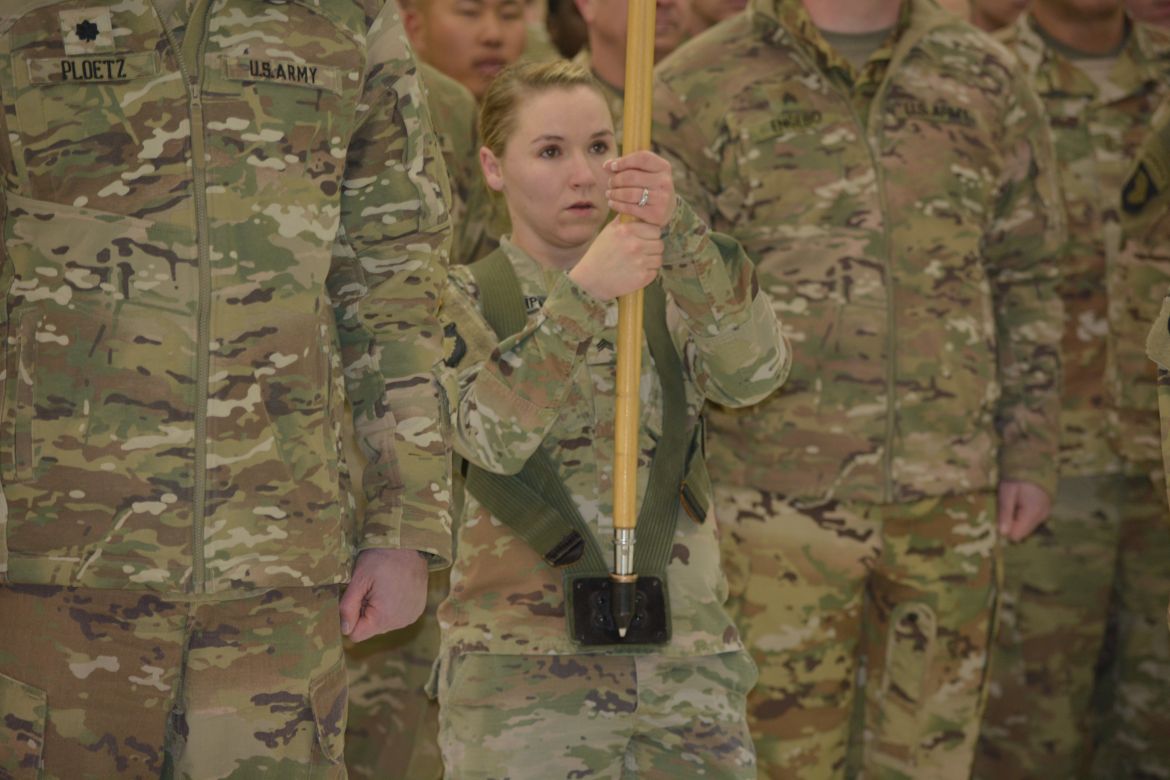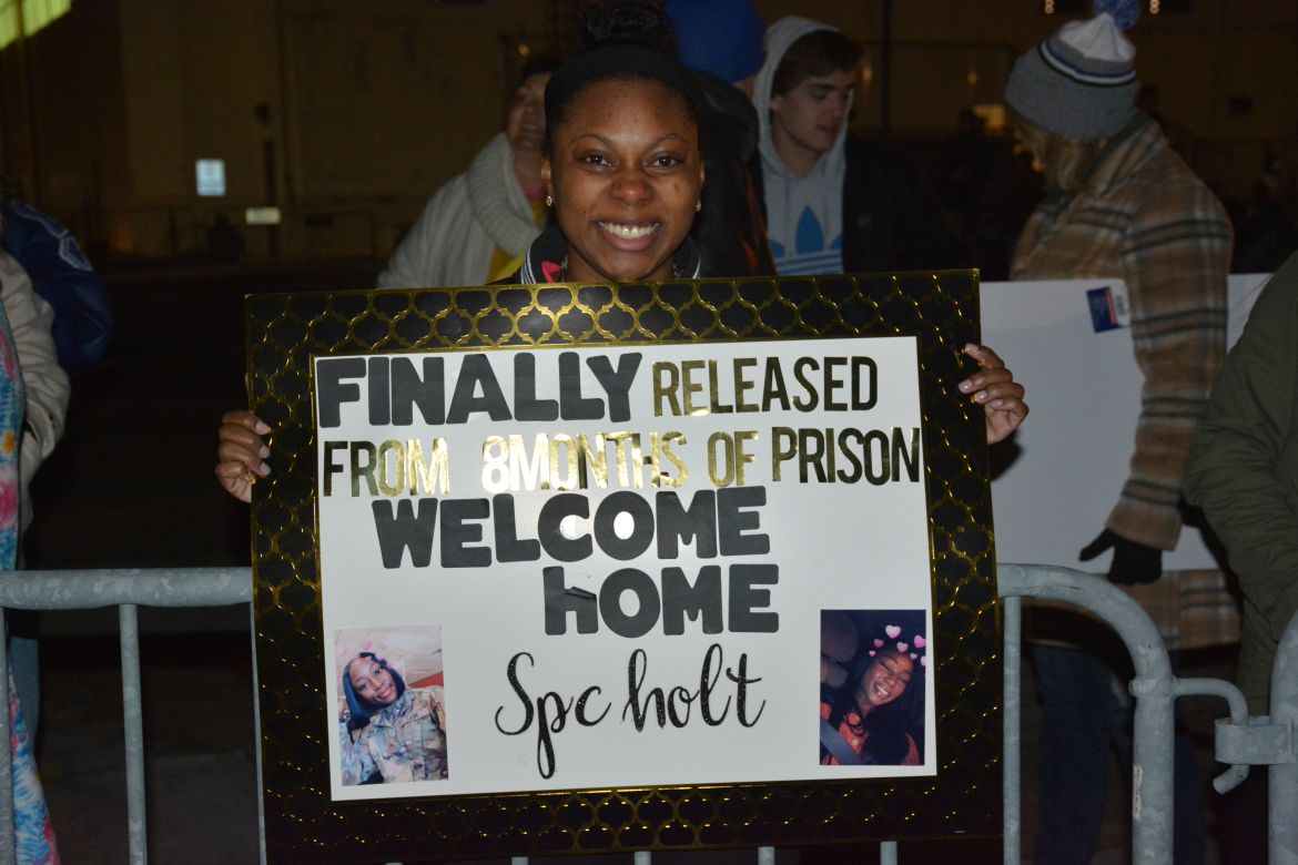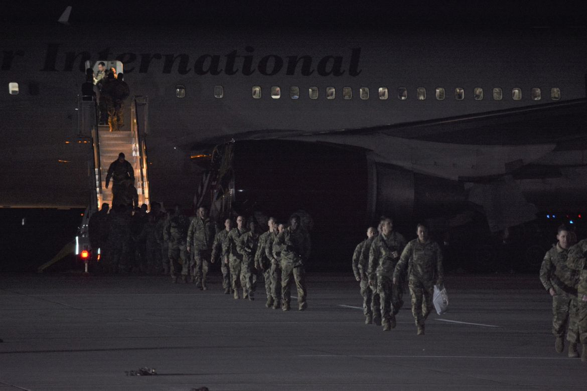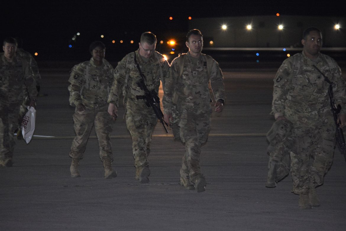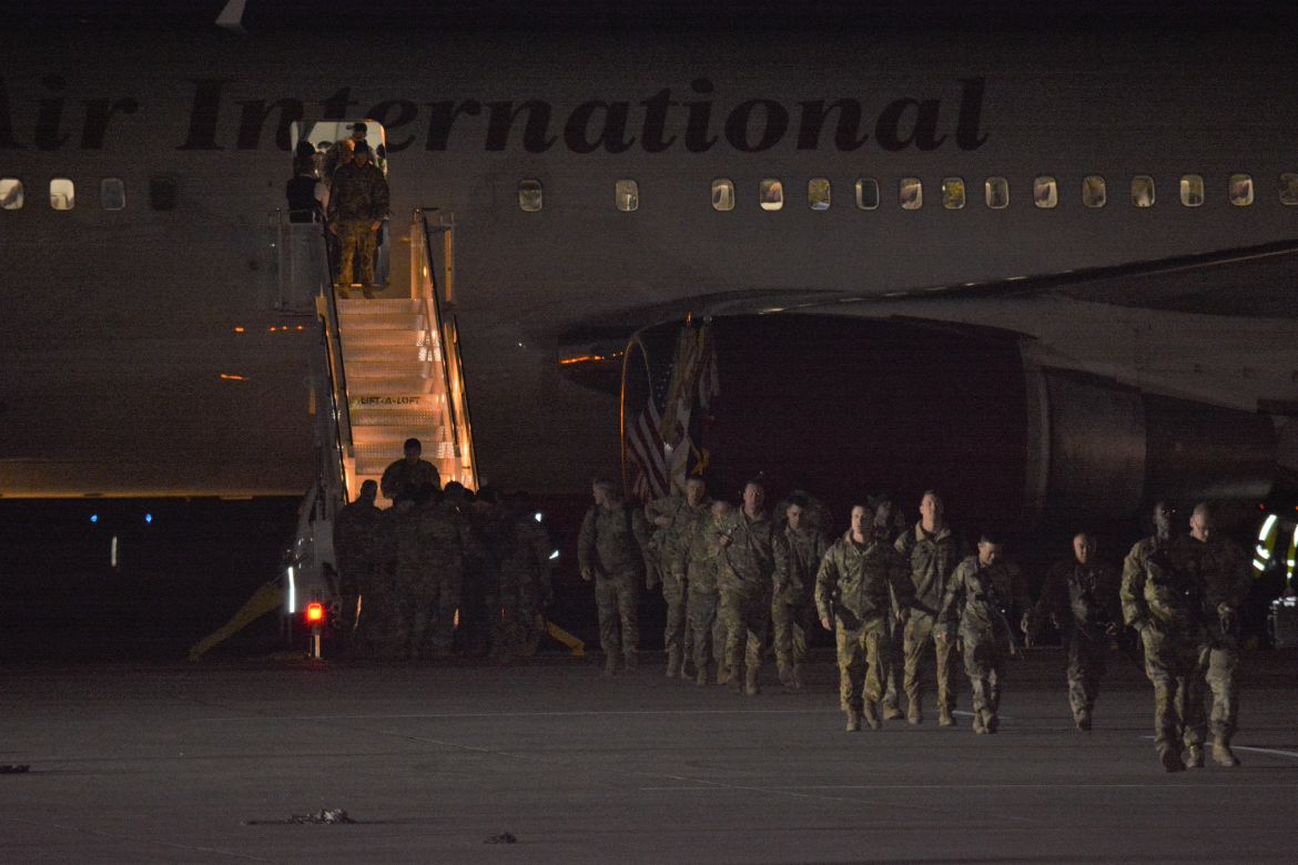 The soldiers were returning from a nine-month deployment to Afghanistan and marched into the hangar at the airfield for a Welcome Home Ceremony in their honor attended by family, friends and fellow soldiers.