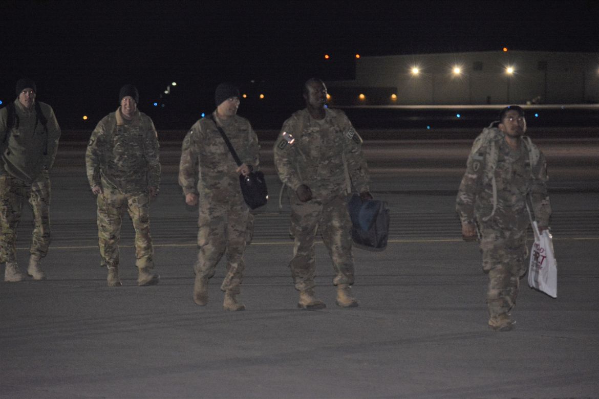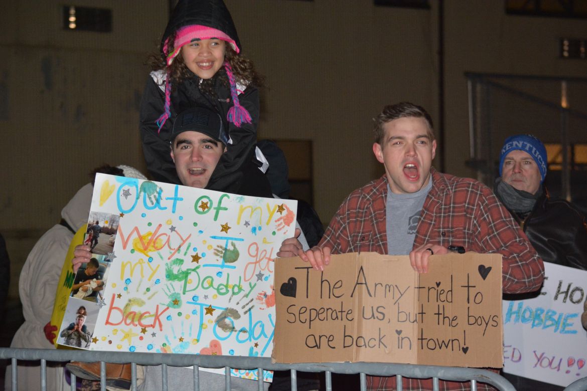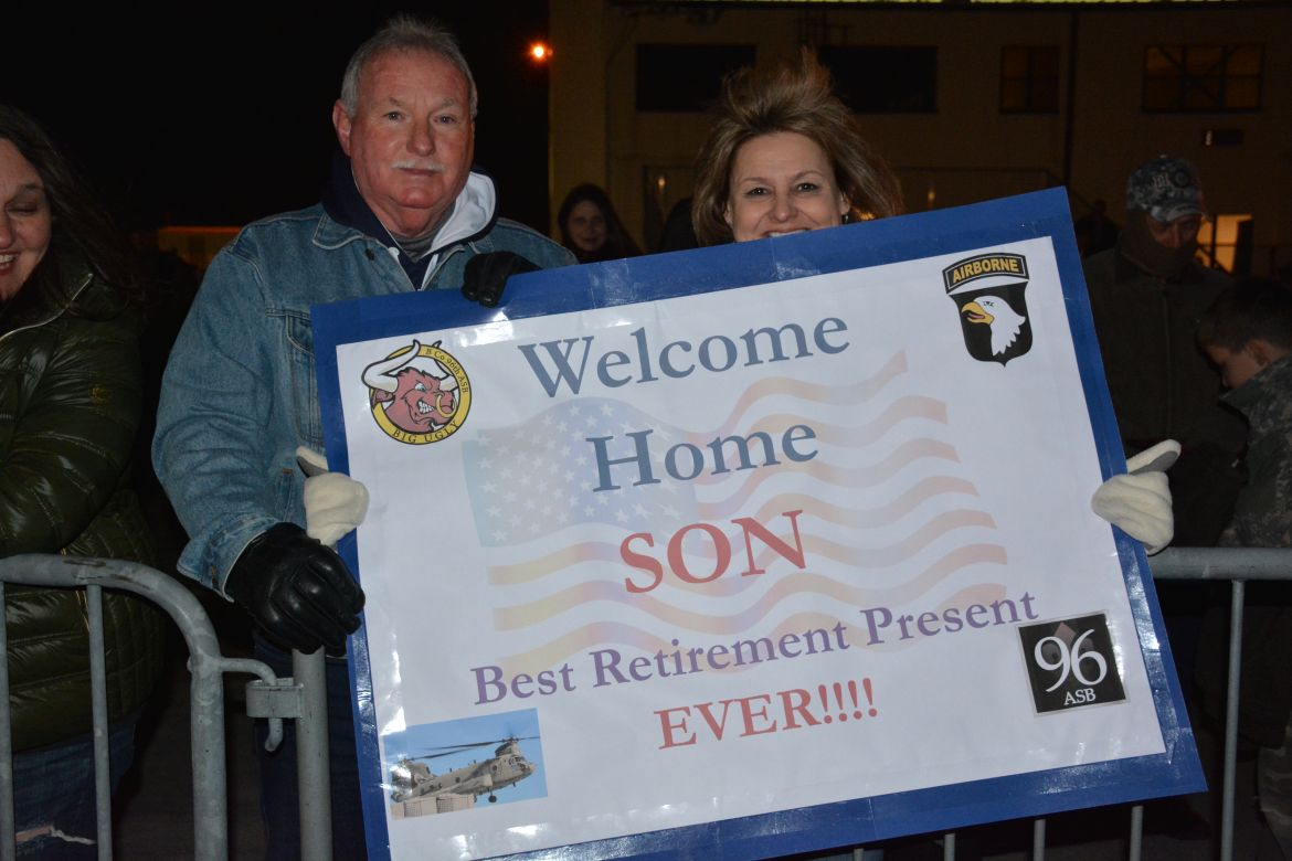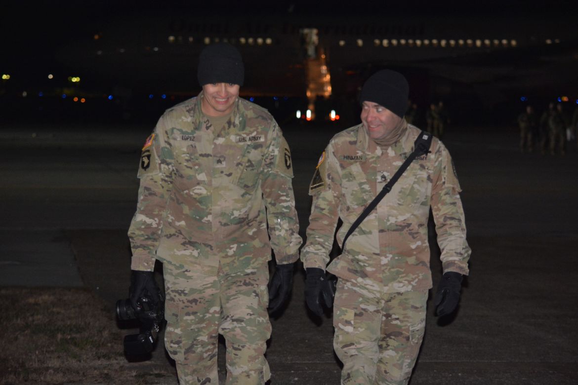 FORT CAMPBELL, KY. – (CLARKSVILLENOW) It was a very cold Tuesday night at Campbell Army Airfield as 177 soldiers with the 101st Combat Aviation Brigade (CAB) and 52nd Ordnance Group (EOD) stepped off the plane to cheers and applause.
