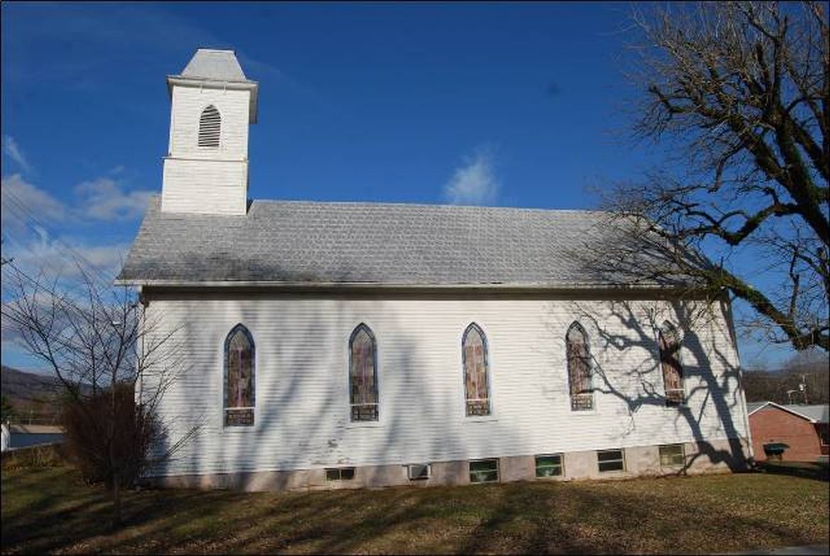 Whitwell Presbyterian Church was built around 1892, although the exact date of construction is still disputed in the community. Primarily Gothic Revival in style, the exterior boasts Gothic arched (peaked) windows and entry door, weatherboard siding, bell tower with a Mansard roof and brackets, and metal shingles on the roof. A distinctive feature of the building is the notched weatherboard in the gable field, forming a decorative pattern. Inside, the stained glass windows that were added around 1958 are the most elaborate feature. Plaster walls, beadboard wainscoting and historic wood pews delineate the interior of the church. Whitwell Cumberland Presbyterian Church retains its historic design and is a good example of rural church design around the turn of the century. The church still has a small congregation and it shares a pastor with two other Cumberland Presbyterian churches.
