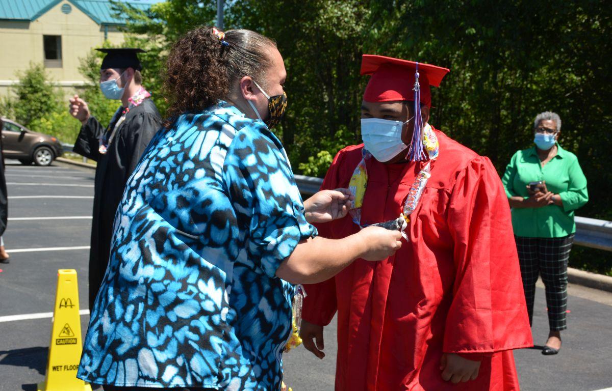 Participants practiced social distancing as they stood in the parking lot, their names, schools and future plans were announced followed by their parents, family and friends driving by honking, waving and cheering.