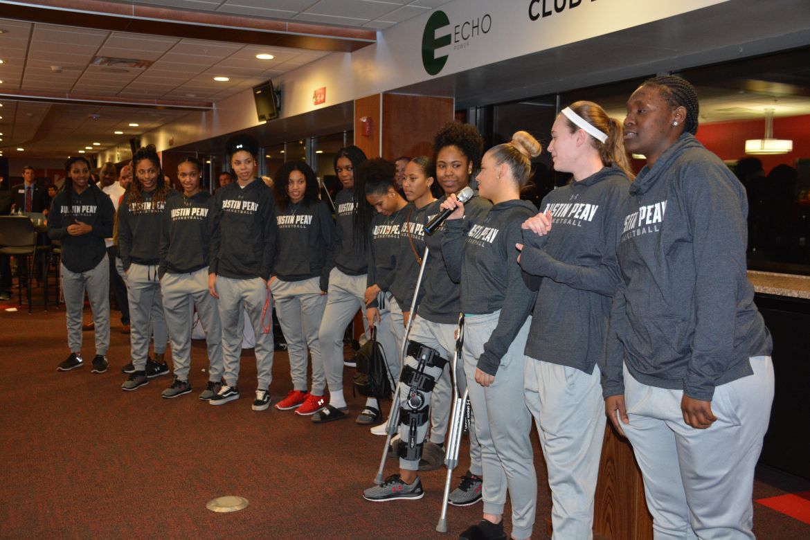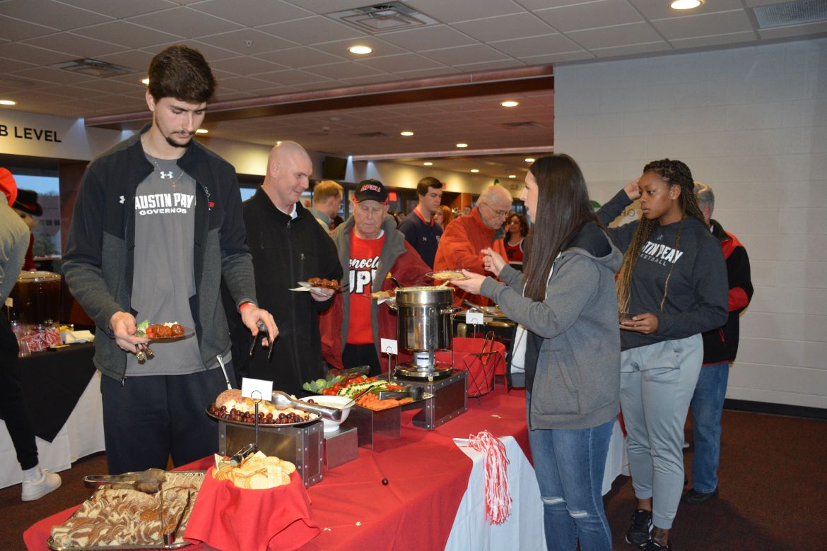 CLARKSVILLE, Tenn. – (ESPN CLARKSVILLE) The ECHO Power Club Level at Fortera Stadium was filled Monday night as fans of the Austin Peay men’s and women’s basketball teams showed their support for the Governors as they head to Evansville, Indiana for the Ohio Valley Conference Basketball (OVC) Championships.