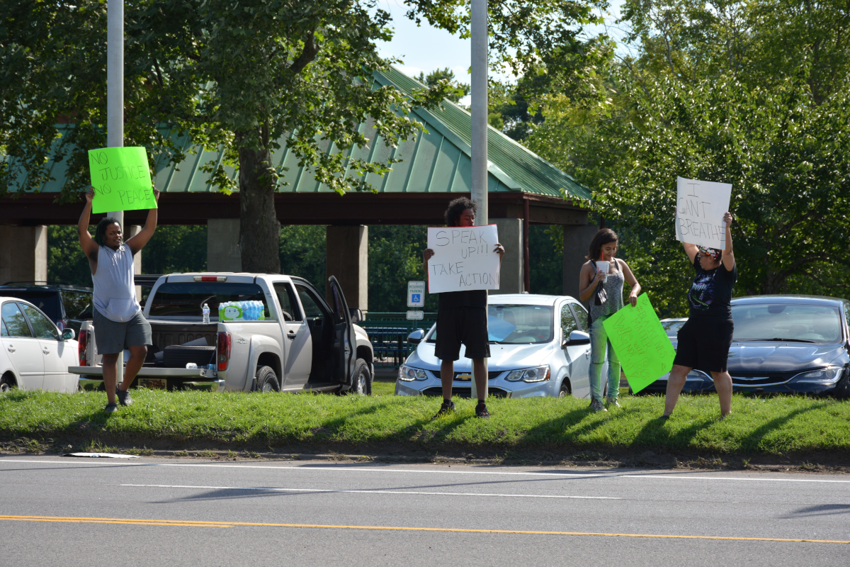A diverse crowd of demonstrators, whose numbers grew throughout the day, waved signs and interacted with passing traffic, many honking in response.