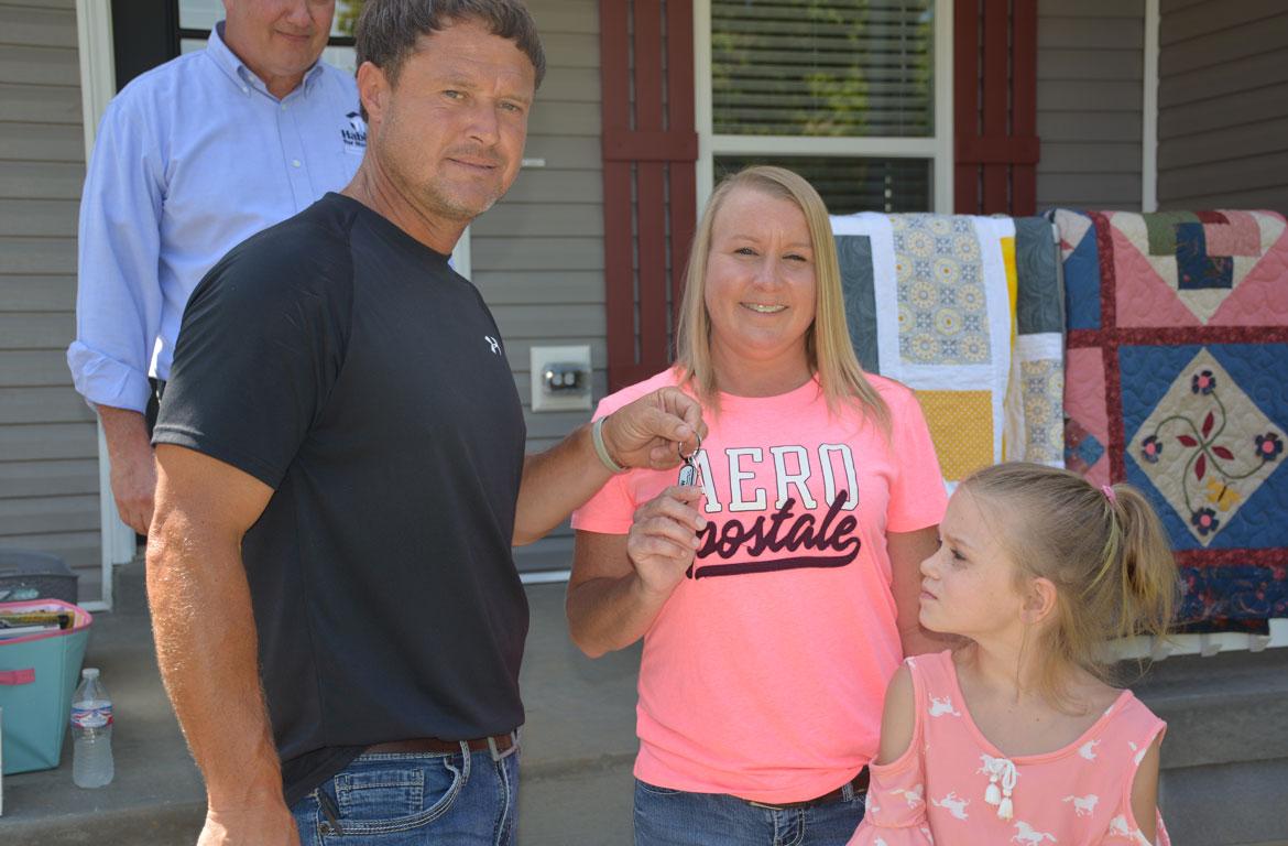 Chris Blackwell with C Blackwell Construction presented the Harris family with the keys to their new home during the dedication ceremony. The Harris family also received a family quilt from Clarksville Quilt Possee, a home library from the Daughters of the American Revolution, a Tennessee tree from the Master Gardners’ Association, a family Bible from Habitat for Humanity, and a basket of housewares from Wyatt Johnson Subaru.