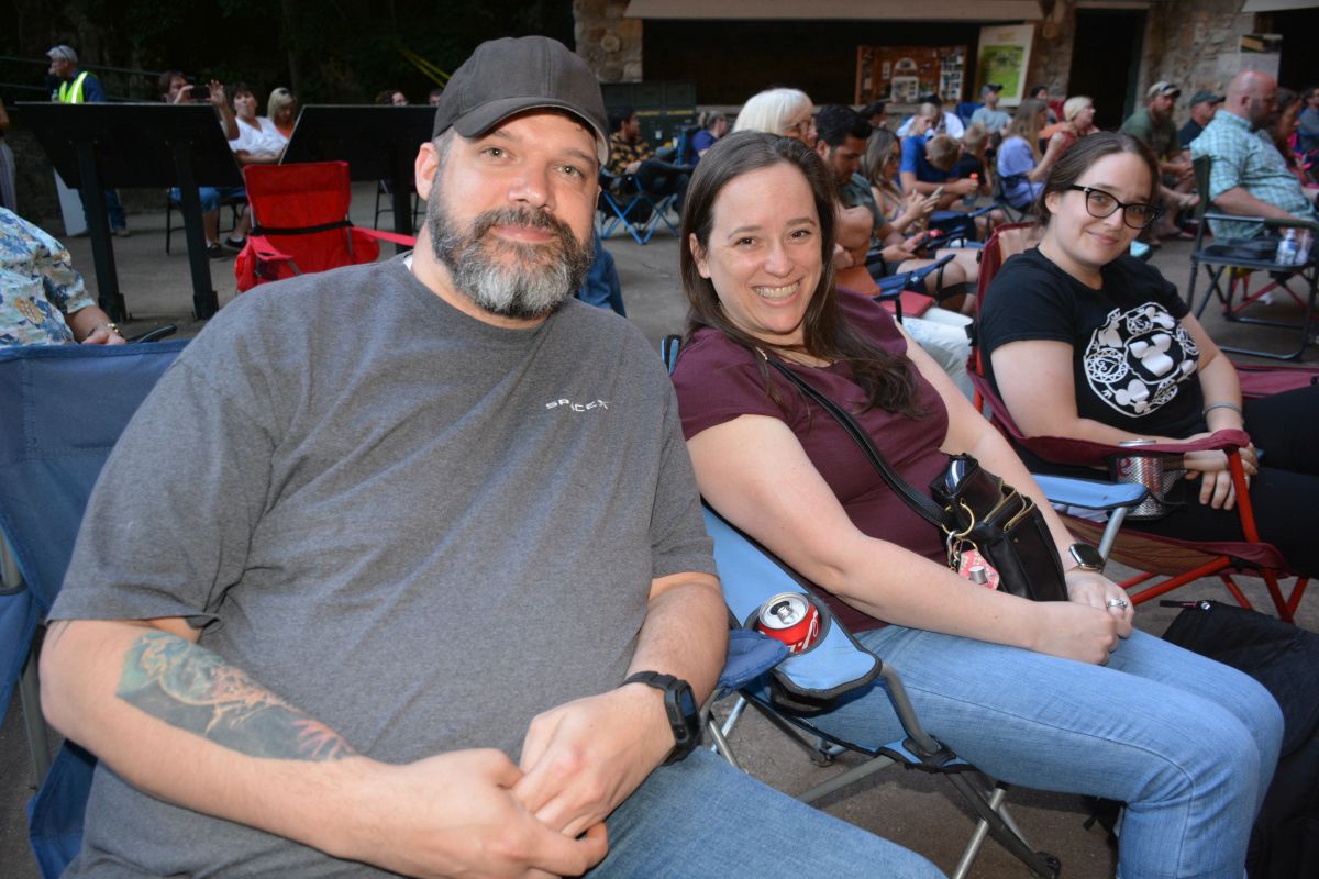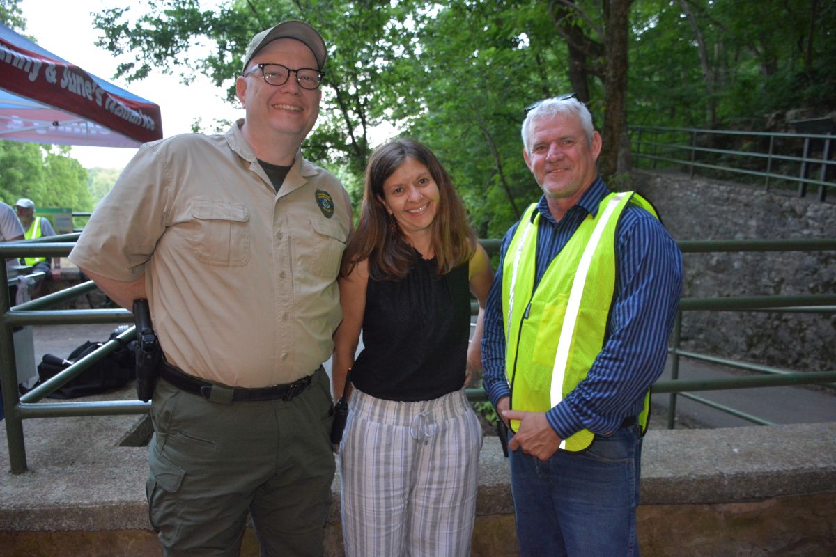 Ranger David Britton, Shana Thornton & Brian Meredith at the Friends of Dunbar Cave, Cooling at the Cave concert featuring Red River Breeze on Jun. 3, 2023. (Lee Erwin)
