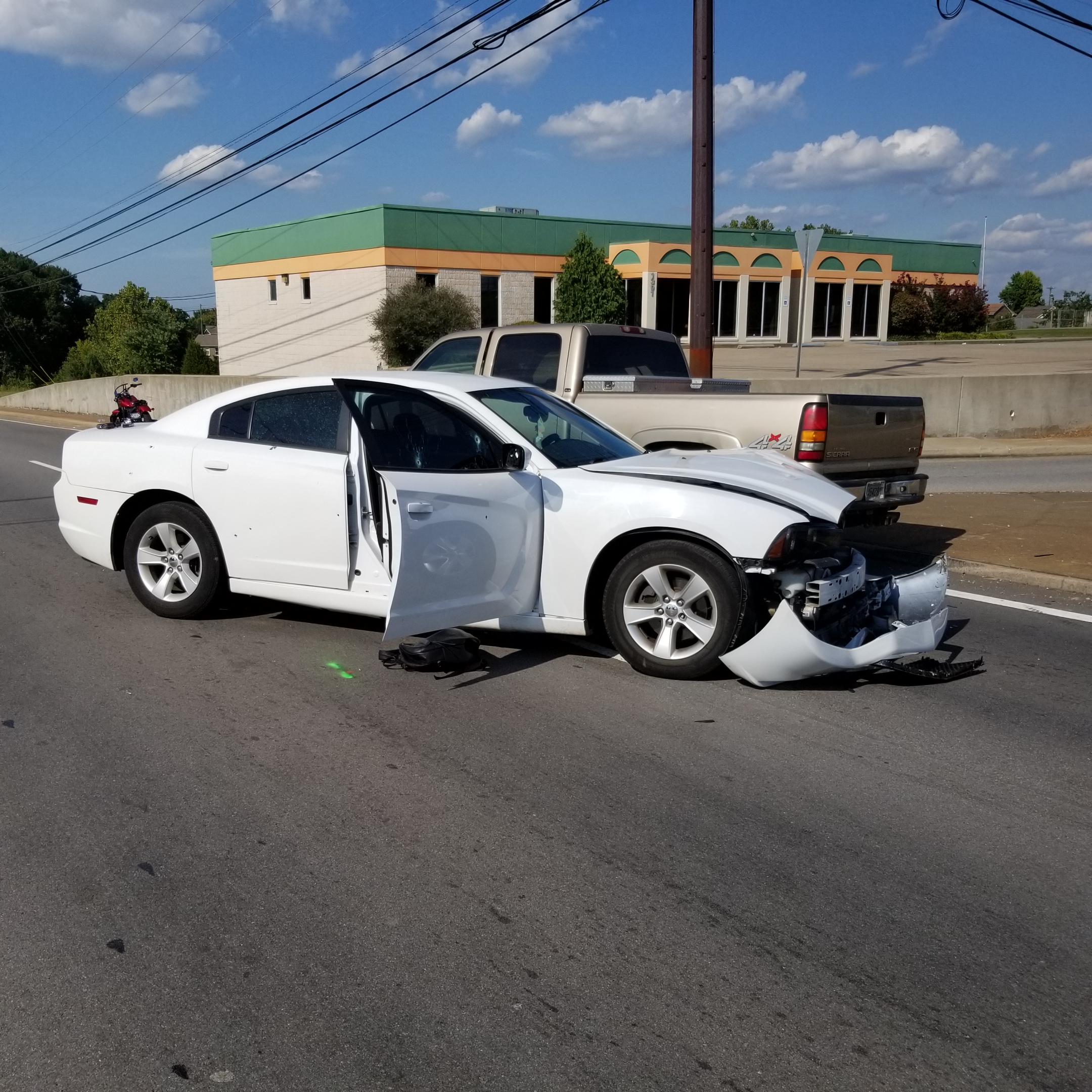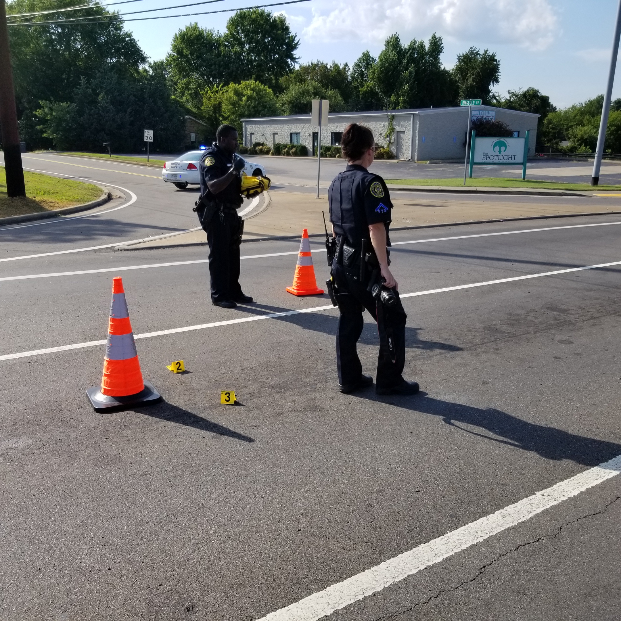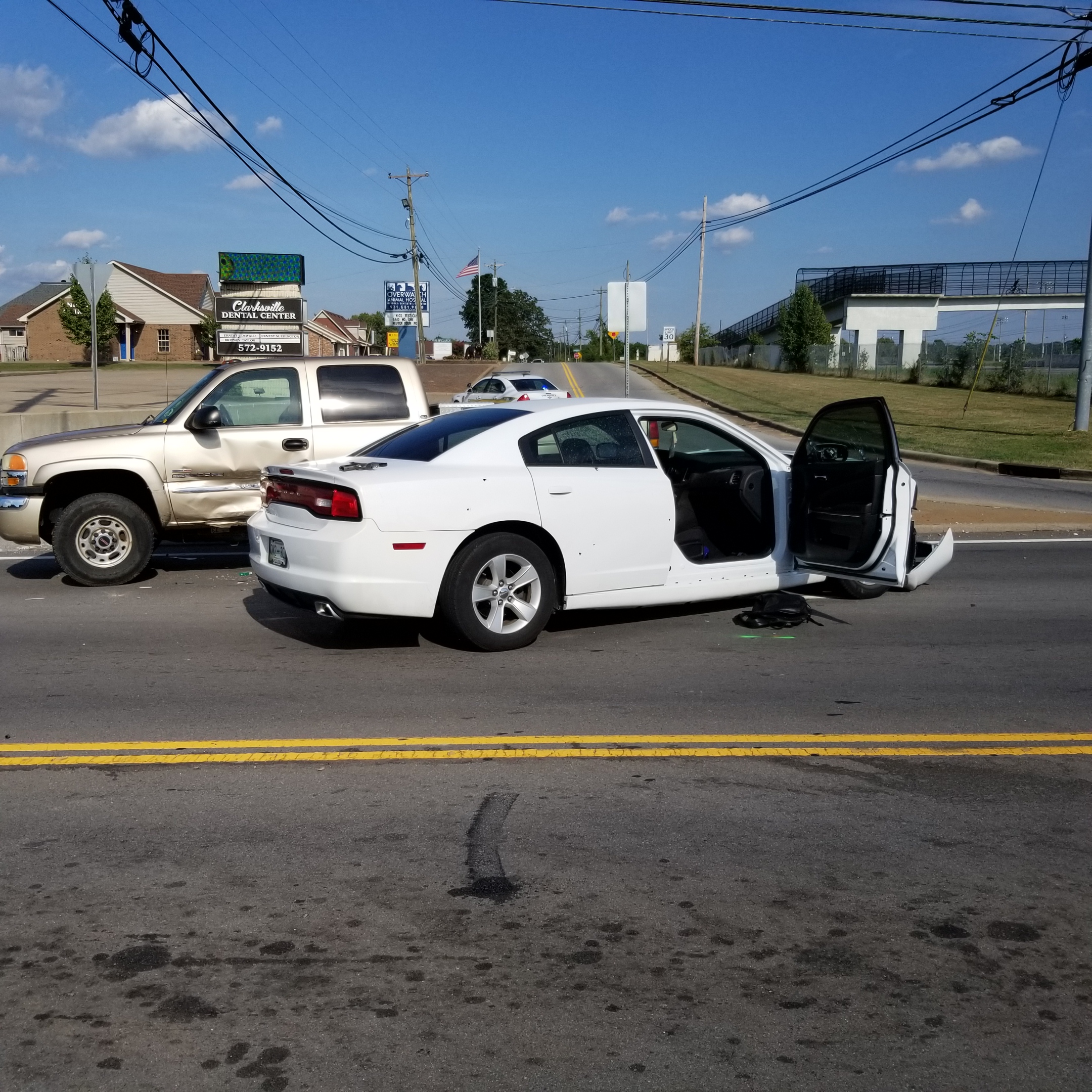 CLARKSVILLE, Tenn. (CLARKSVILLENOW) –  Clarksville Police are processing a crime scene involving two Dodge Chargers. One vehicle shot at the other causing an accident near 101st Airborne Parkway at the intersection of  Peachers Mill Rd and McClardy Rd.