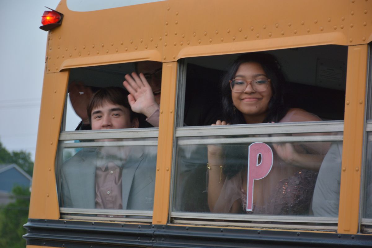 A decorated school bus brings a group of students to the Montgomery Central High School 2023 prom at the Wilma Rudolph Event Center on May 20, 2023. (Lee Erwin)