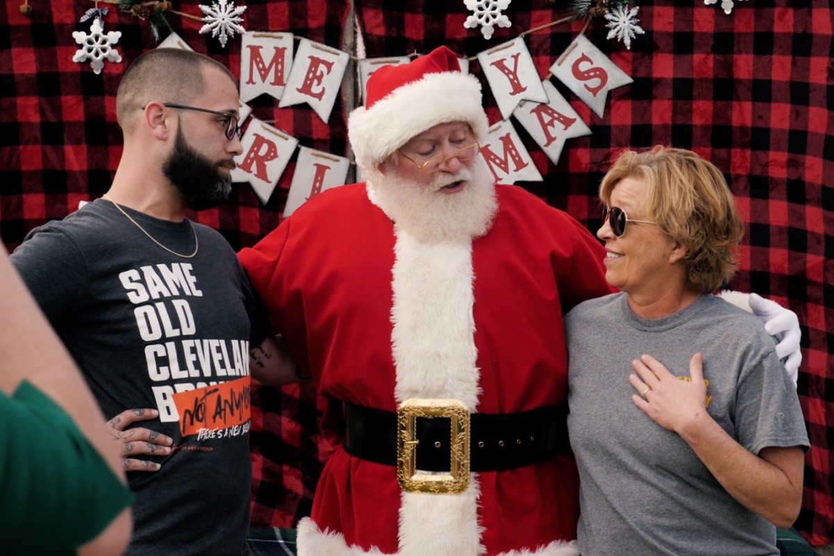Chris Brooks, left, and Monica Meeks visit with Santa Claus at the Christmas-themed Q108 Clarksville Vintage Fair at Beachaven Vineyards & Winery on Nov. 5, 2022. (Jim Key)