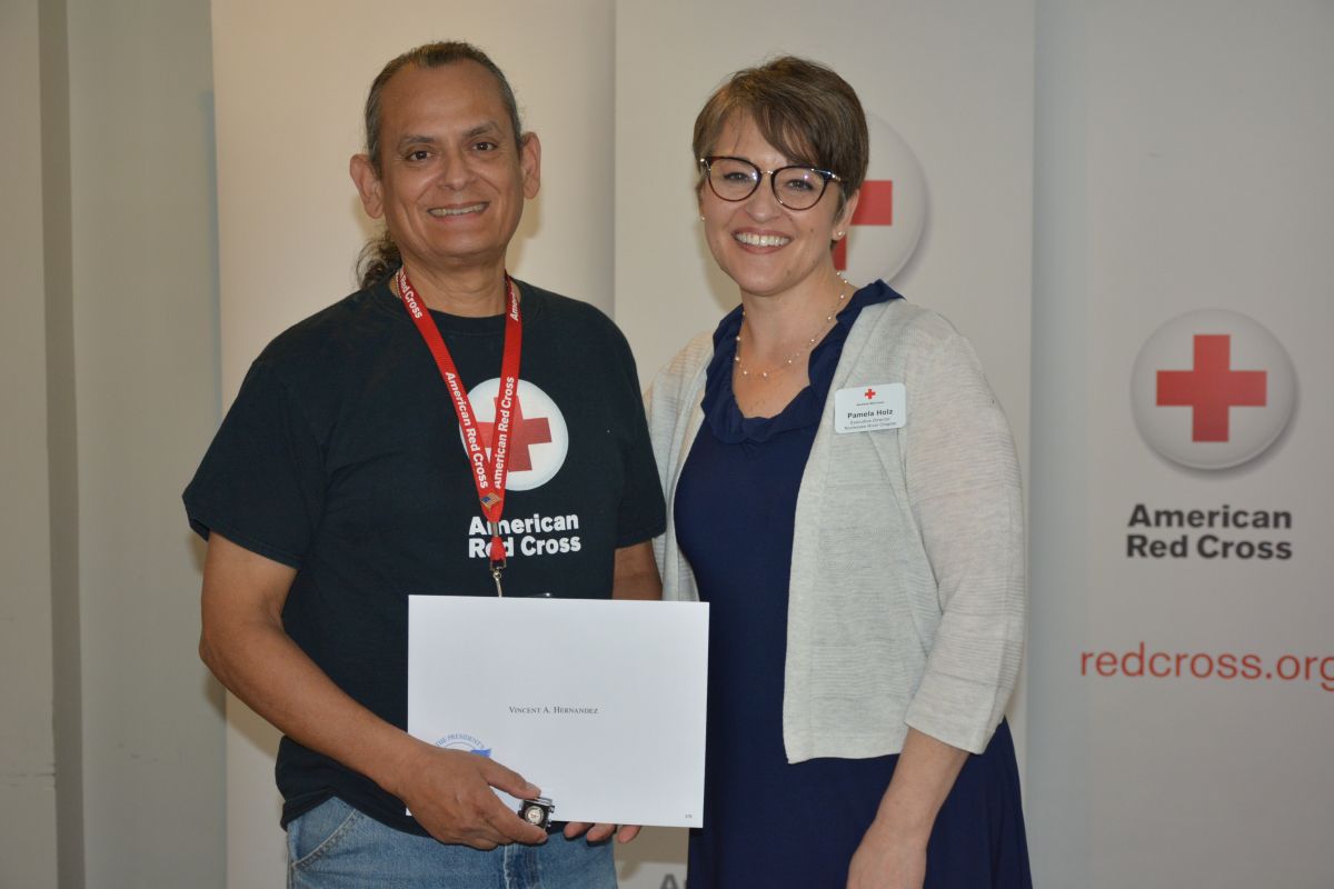 Red Cross Volunteer Vincent A. Hernandez with Executive Director Pamela Holz, at the Tennessee River Chapter of the American Red Cross Volunteer Appreciation Luncheon on April 30, 2022. (Lee Erwin)