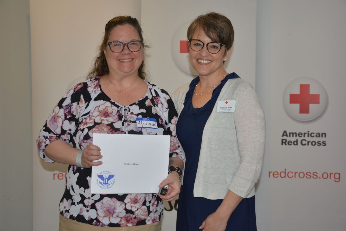 Red Cross Volunteer Heather Davis with Executive Director Pamela Holz, at the Tennessee River Chapter of the American Red Cross Volunteer Appreciation Luncheon on April 30, 2022. (Lee Erwin)