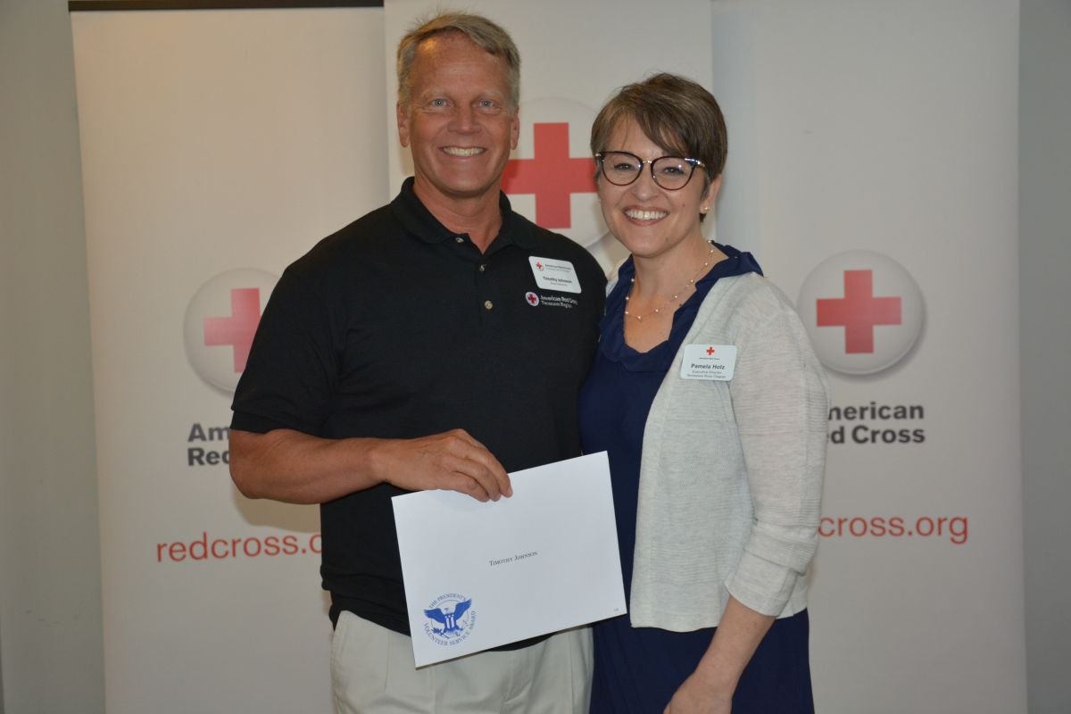 Red Cross Volunteer Timothy Johnson with Executive Director Pamela Holz, at the Tennessee River Chapter of the American Red Cross Volunteer Appreciation Luncheon on April 30, 2022. (Lee Erwin)