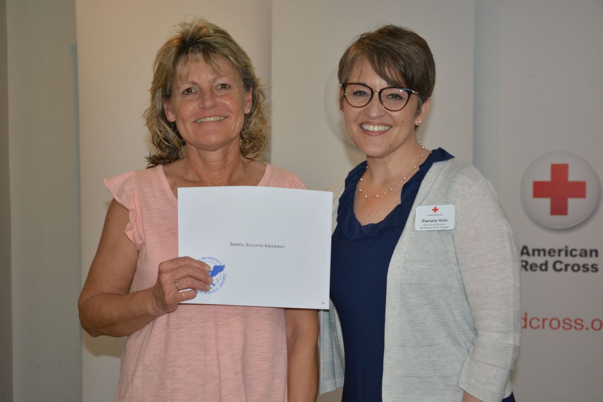 Red Cross Volunteer Sheryl Suzanne Kreckman with Executive Director Pamela Holz, at the Tennessee River Chapter of the American Red Cross Volunteer Appreciation Luncheon on April 30, 2022. (Lee Erwin)