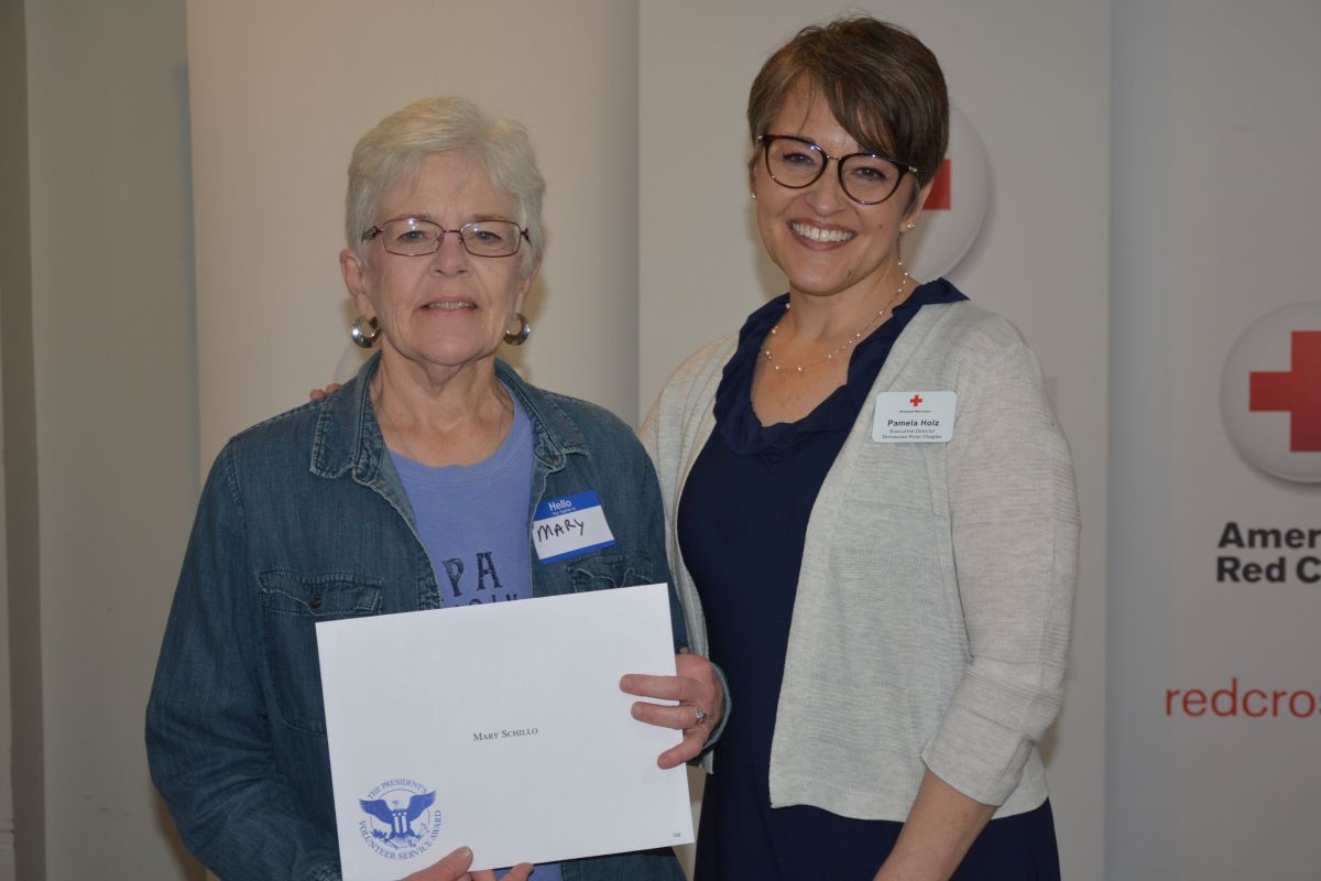 Red Cross Volunteer Mary Schillo with Executive Director Pamela Holz, at the Tennessee River Chapter of the American Red Cross Volunteer Appreciation Luncheon on April 30, 2022. (Lee Erwin)