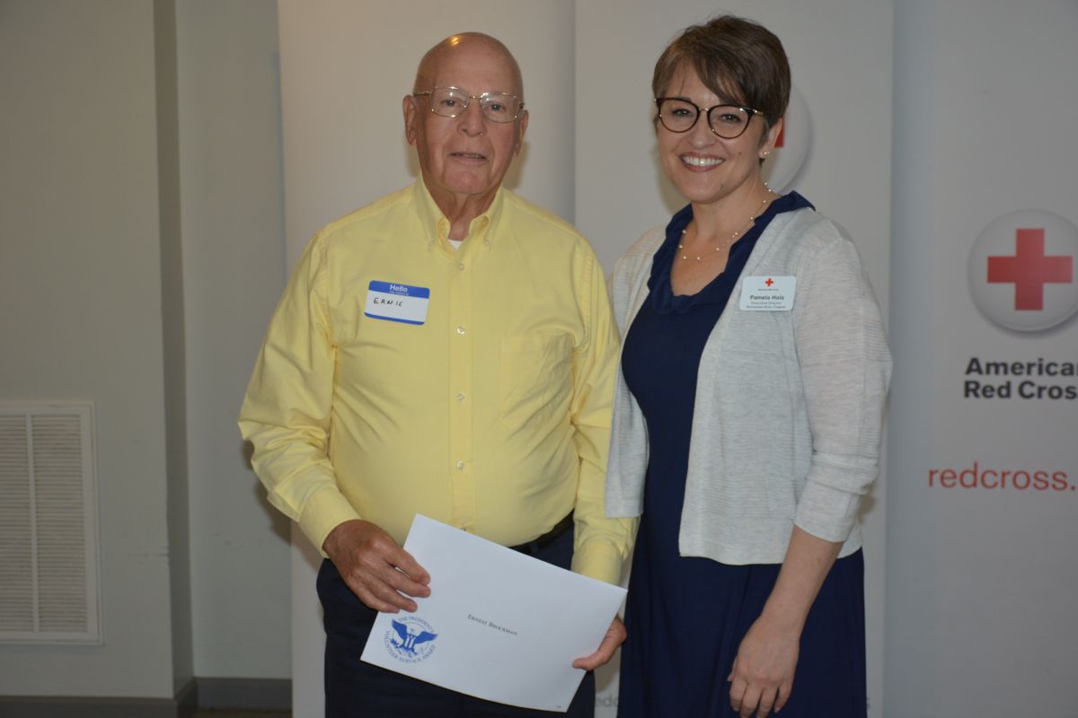 Red Cross Volunteer Ernest Brockman with Executive Director Pamela Holz, at the Tennessee River Chapter of the American Red Cross Volunteer Appreciation Luncheon on April 30, 2022. (Lee Erwin)