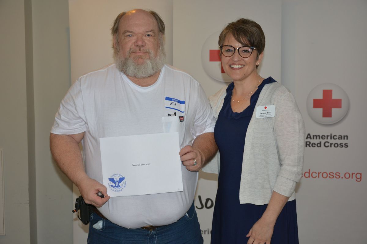 Red Cross Volunteer Edward England with Executive Director Pamela Holz, at the Tennessee River Chapter of the American Red Cross Volunteer Appreciation Luncheon on April 30, 2022. (Lee Erwin)