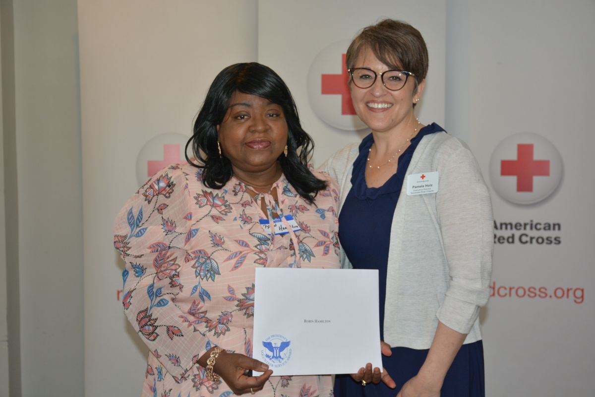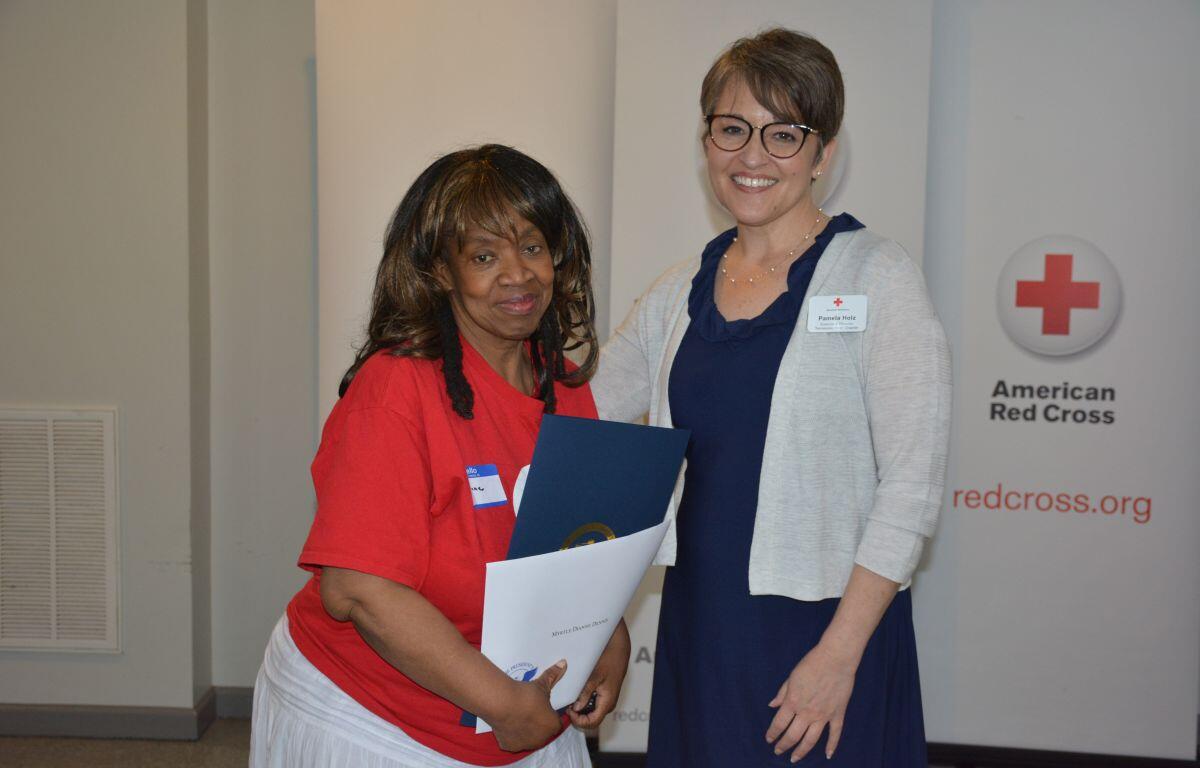 Red Cross Volunteer Robin Hamilton with Executive Director Pamela Holz, at the Tennessee River Chapter of the American Red Cross Volunteer Appreciation Luncheon on April 30, 2022. (Lee Erwin)