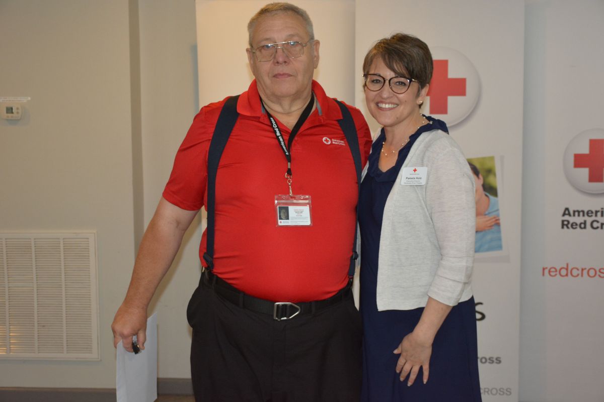 Red Cross Volunteer Raymond Swadley with Executive Director Pamela Holz, at the Tennessee River Chapter of the American Red Cross Volunteer Appreciation Luncheon on April 30, 2022. (Lee Erwin)
