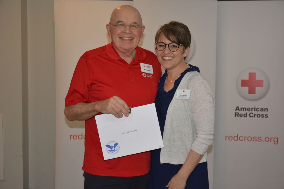 Red Cross Volunteer Ronald D. Lanfear with Executive Director Pamela Holz, at the Tennessee River Chapter of the American Red Cross Volunteer Appreciation Luncheon on April 30, 2022. (Lee Erwin)