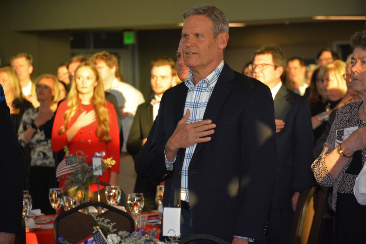 Tennessee Governor Bill Lee during the Pledge of Allegiance at the Montgomery County Republican Party Lincoln Reagan Dinner, on Apr.1 2022. (Lee Erwin).