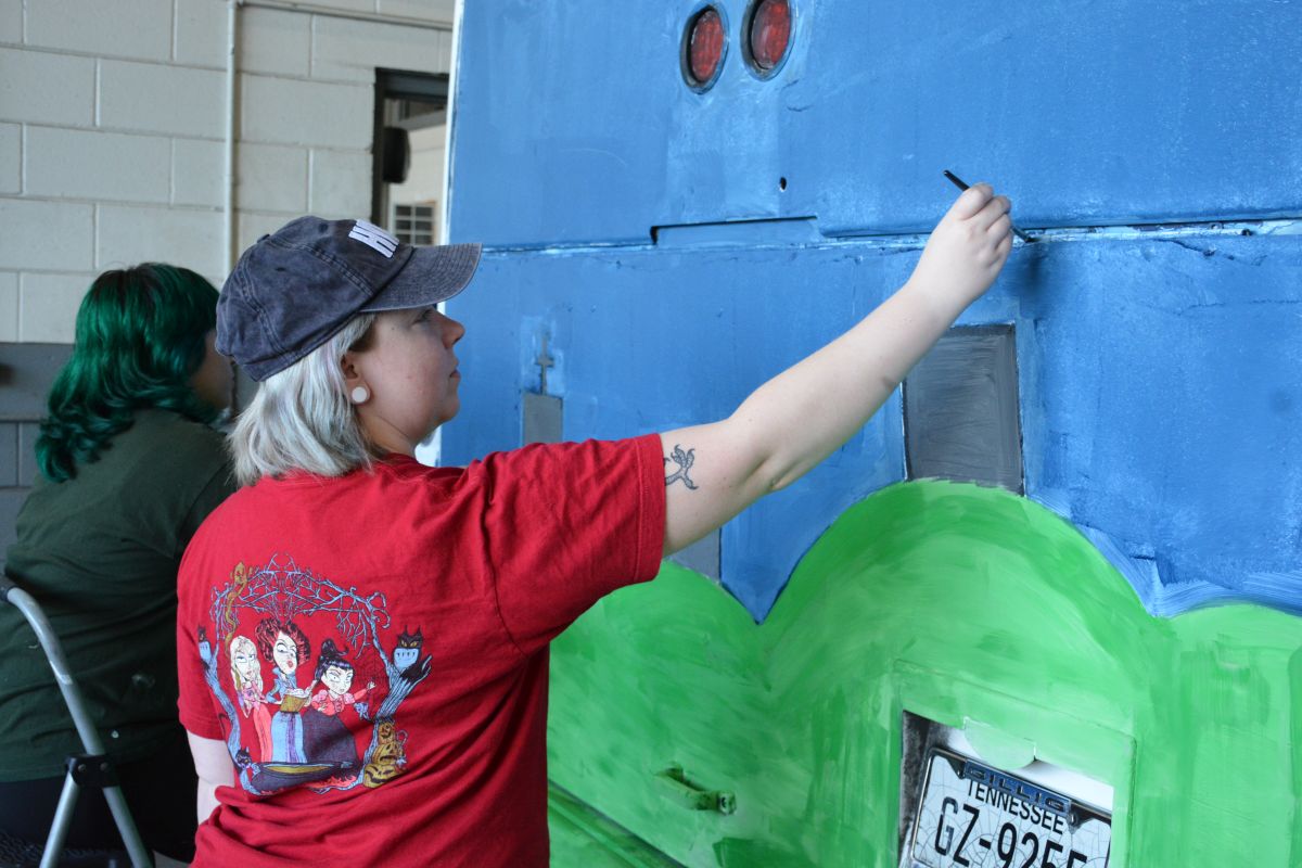 Art teacher, Ms. Rebecca Smith from Northwest High School, paints the Clarksville Transit System Spooky Special bus for Halloween on Oct 26, 2023. (Lee Erwin)