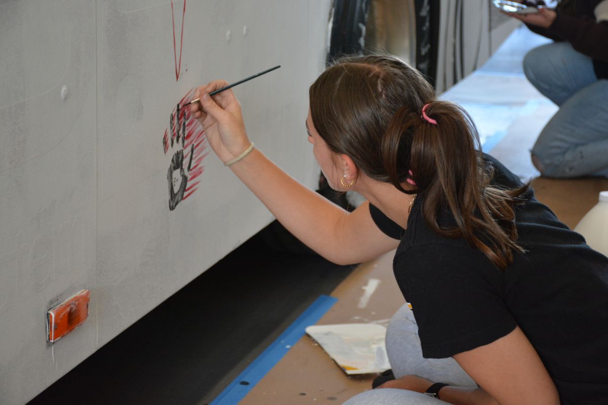 An art student from Northwest High School paints the Clarksville Transit System Spooky Special bus for Halloween on Oct 26, 2023. (Lee Erwin)