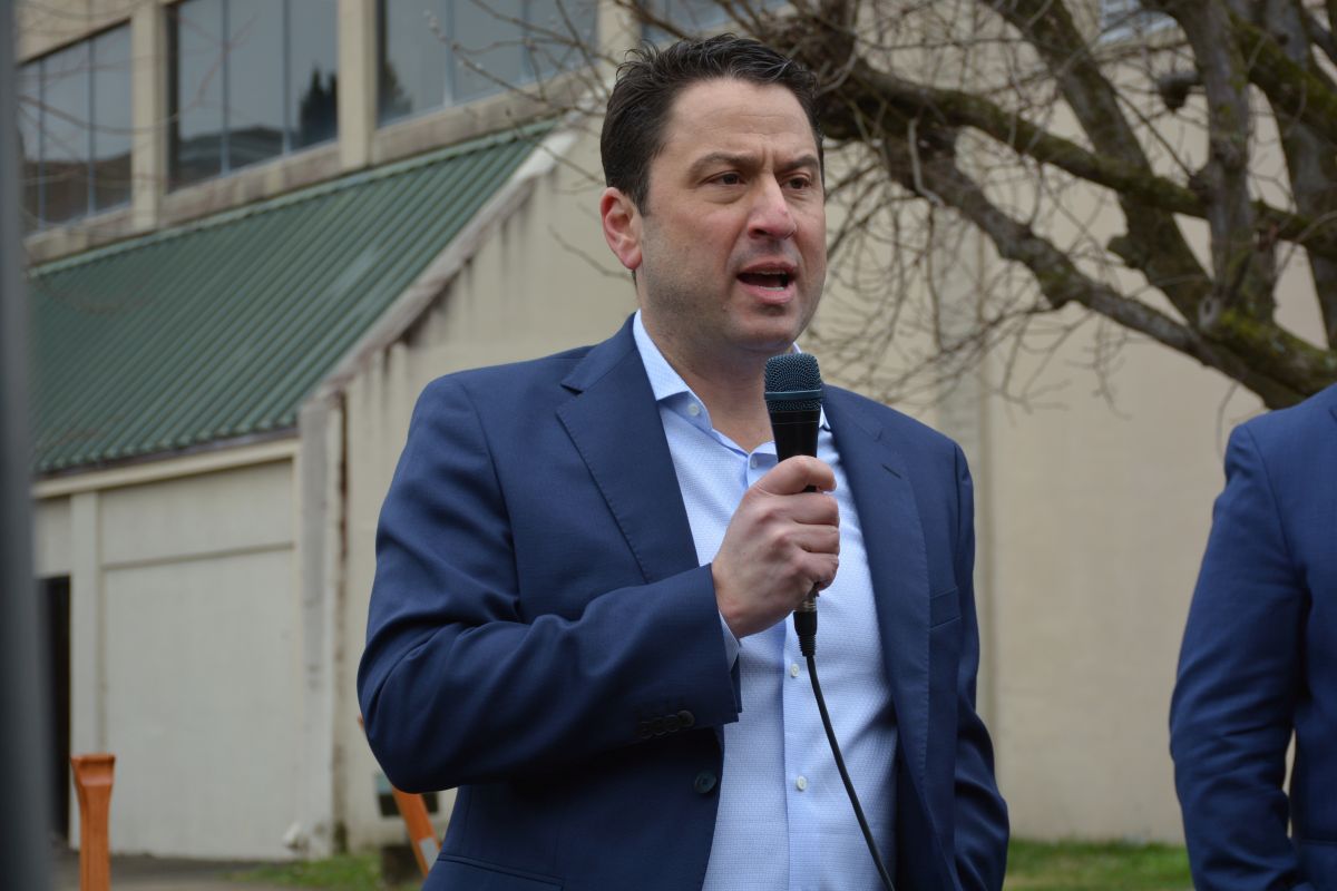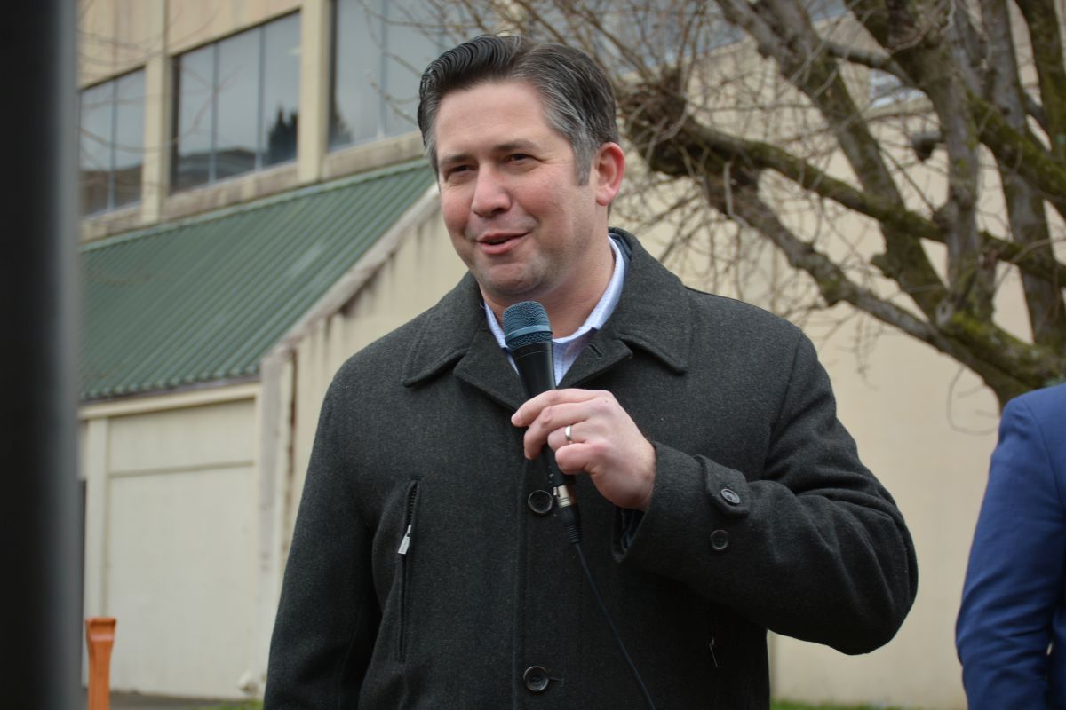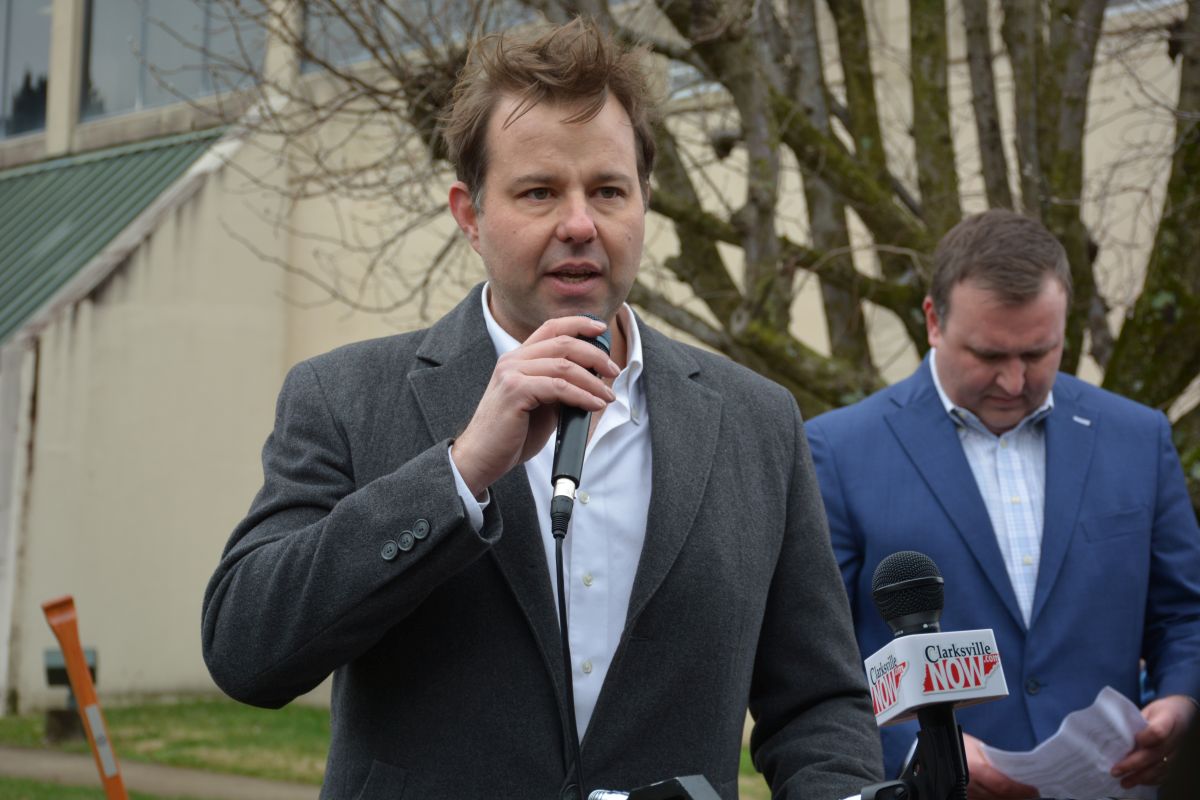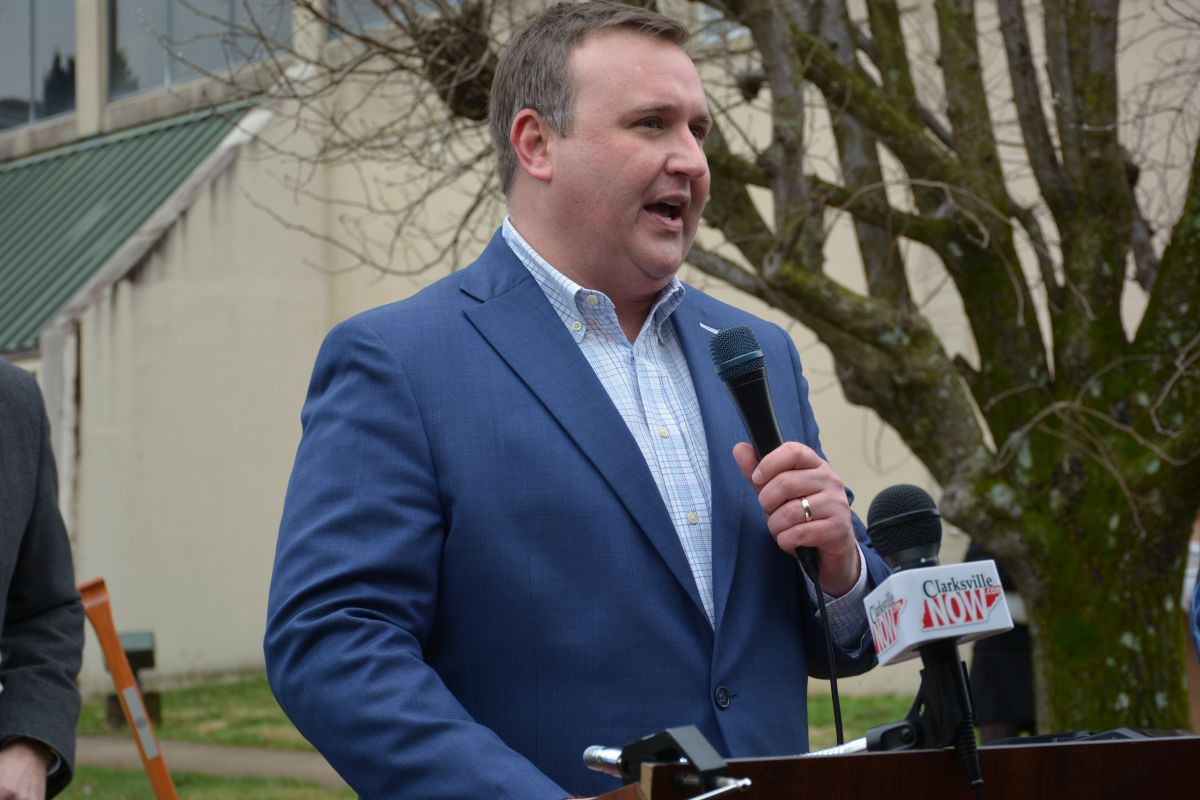 Ryan Batson speaking at the groundbreaking of the new Riverview Square, at the site of the former Riverview Inn in downtown Clarksville on Jan. 25, 2023. (Lee Erwin)