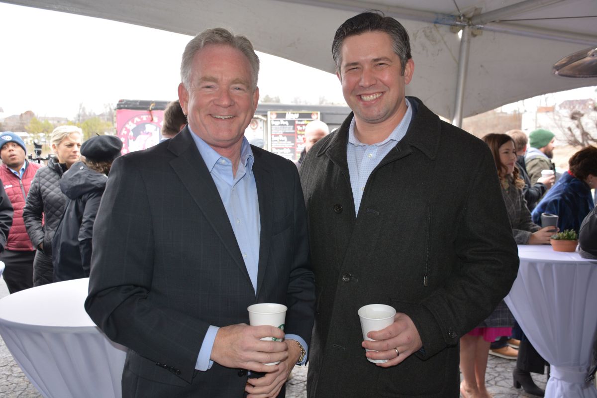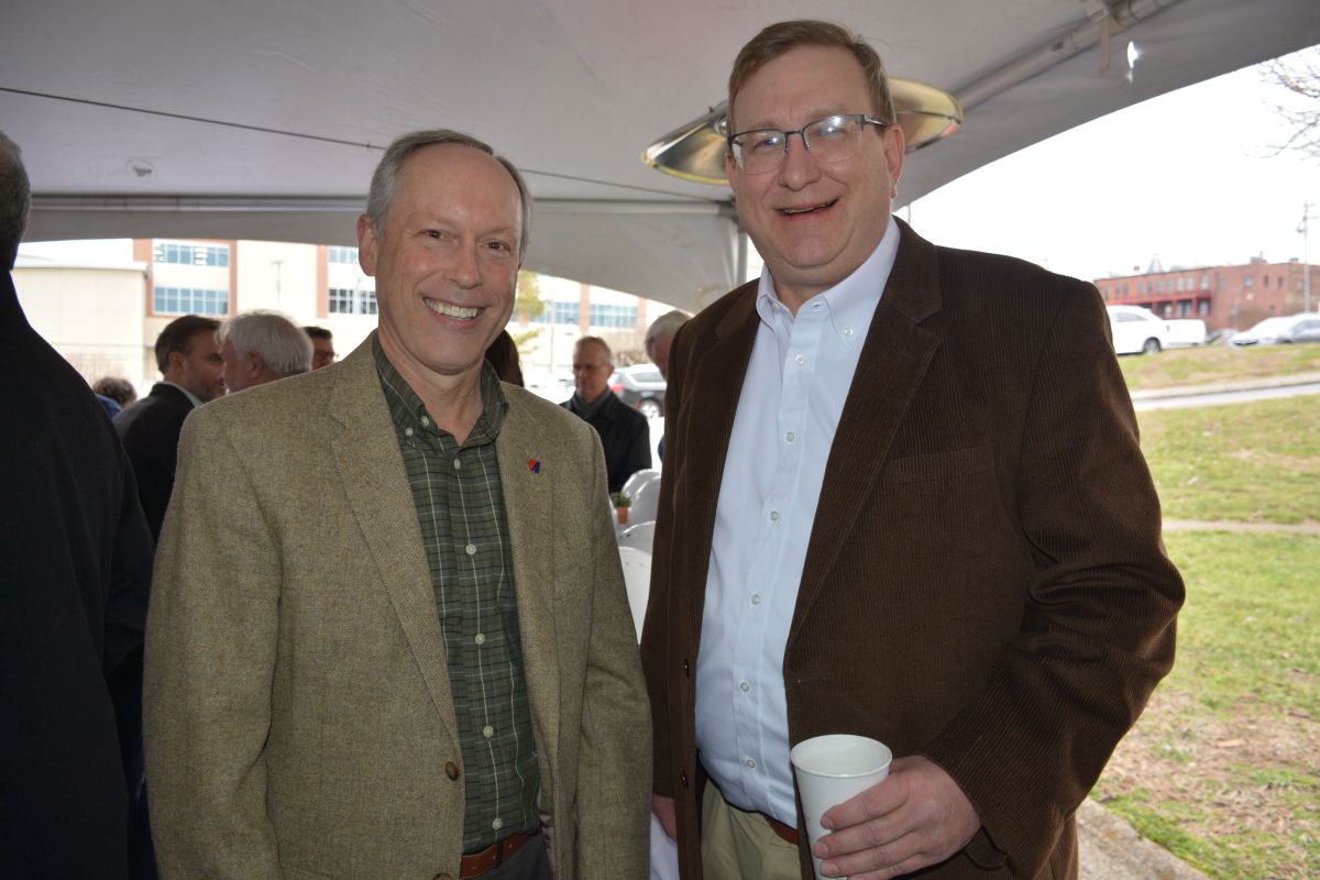 John Peck and Mayor Wes Golden at the Groundbreaking of the new Riverview Square, at the site of the former Riverview Inn in downtown Clarksville on Jan. 25, 2023. (Lee Erwin)