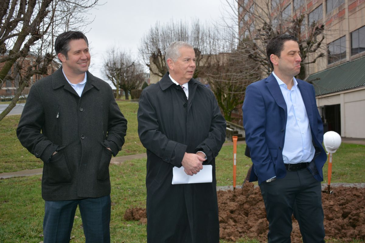 Mayor Wes Golden, Mayor Joe Pitts, and Adam Arnold, at the groundbreaking of the new Riverview Square, at the site of the former Riverview Inn in downtown Clarksville on Jan. 25, 2023. (Lee Erwin)