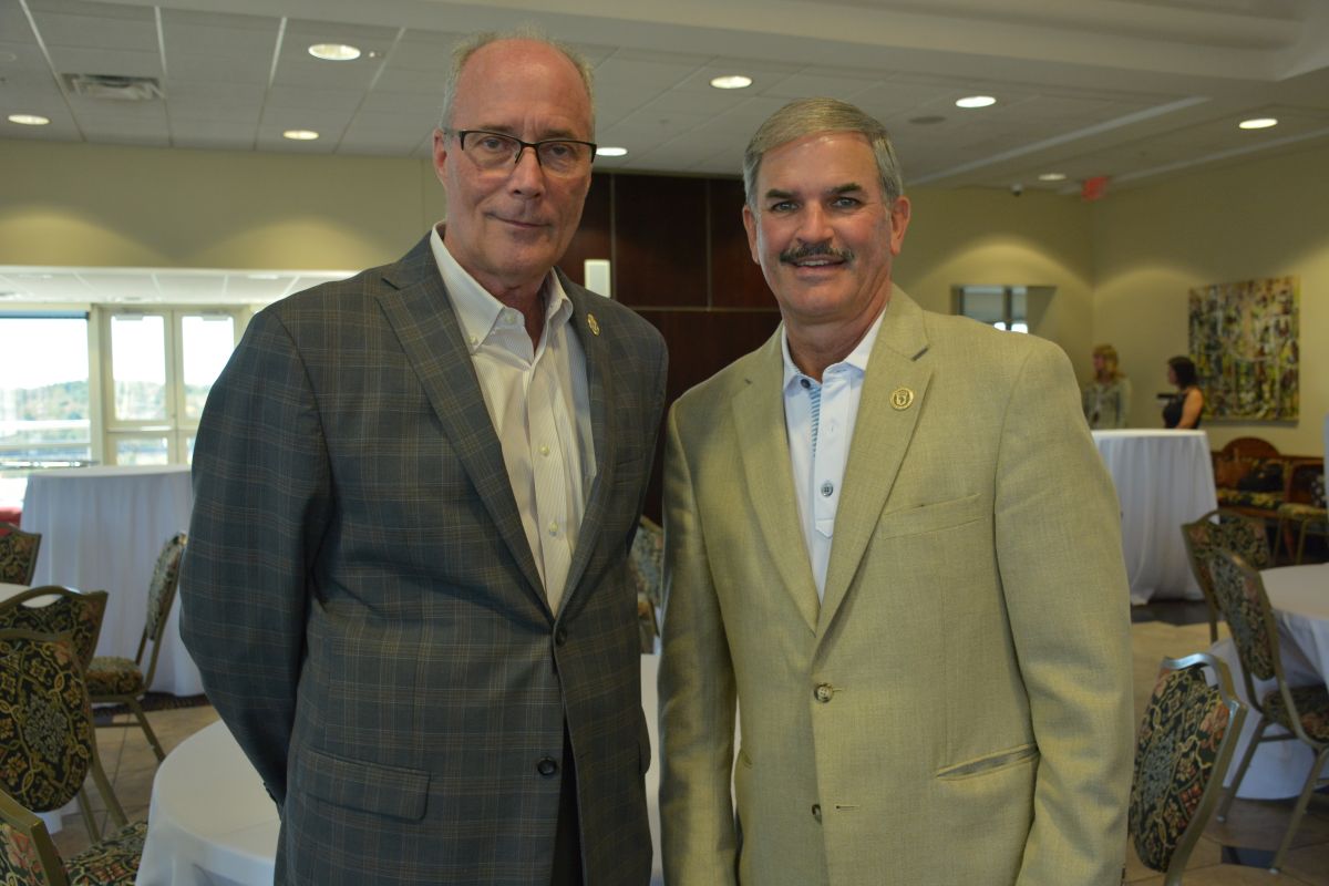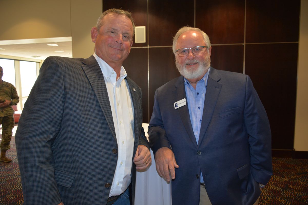 Former Montgomery County Mayor Jim Durrett and Sammy Stuard, CEO and President of F&M Bank, at the visit of Major General Iulian Berdila, Chief of Romania Land Forces, and Major General JP McGee, Commander of the 101st Airborne Division (Air Assault) and Fort Campbell, at F&M Bank on, Oct. 14, 2022. (Lee Erwin).