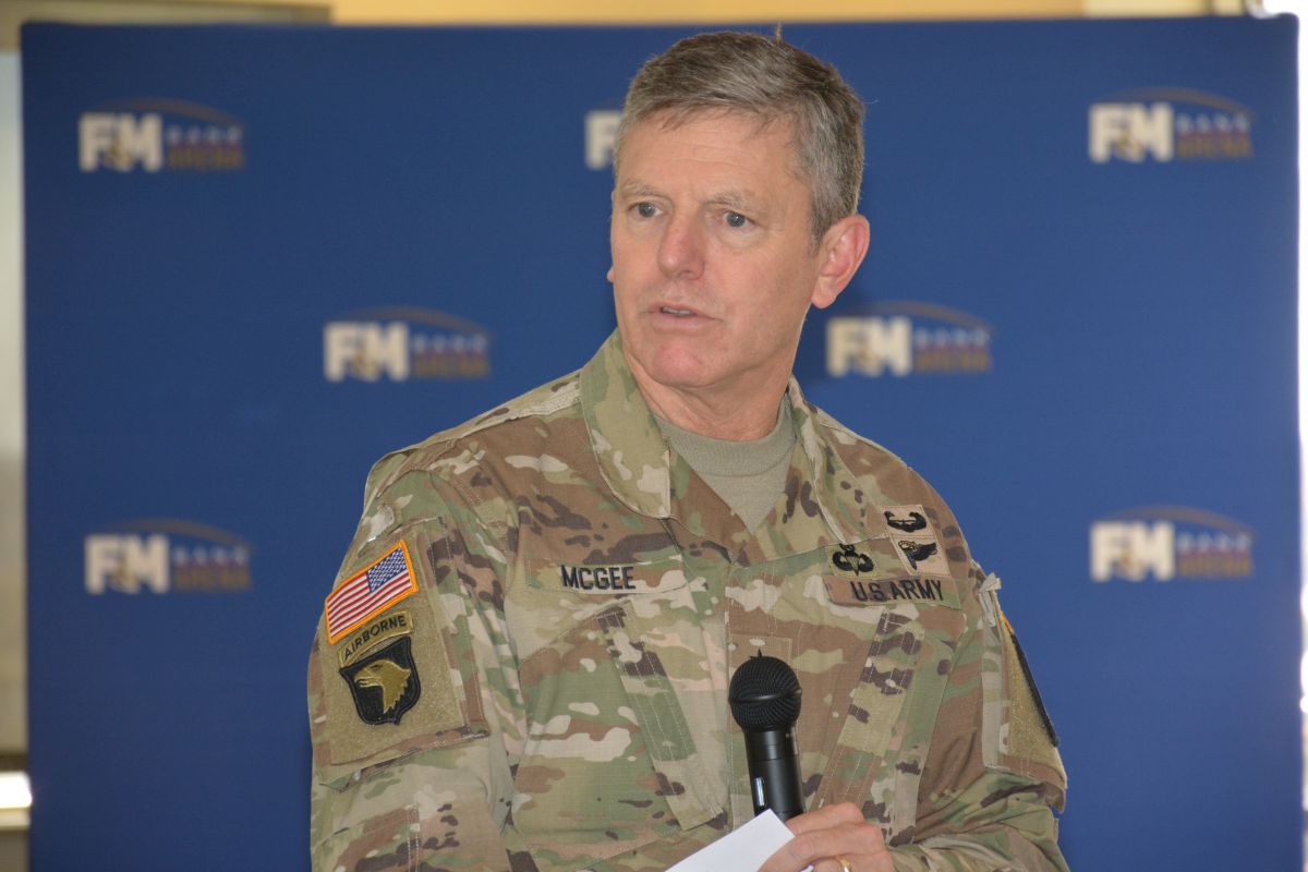 Major General JP McGee, Commander of the 101st Airborne Division (Air Assault) and Fort Campbell, speaking at F&M Bank on, Oct. 14, 2022. (Lee Erwin).