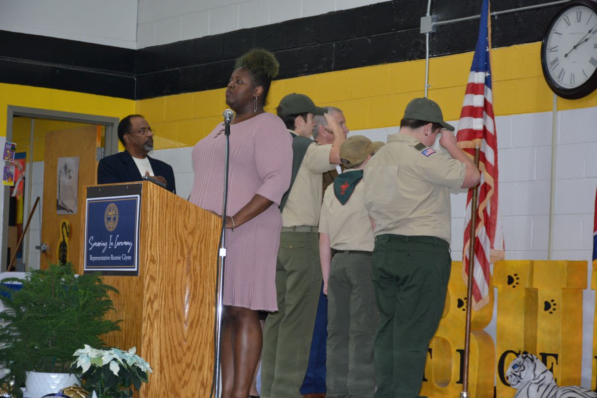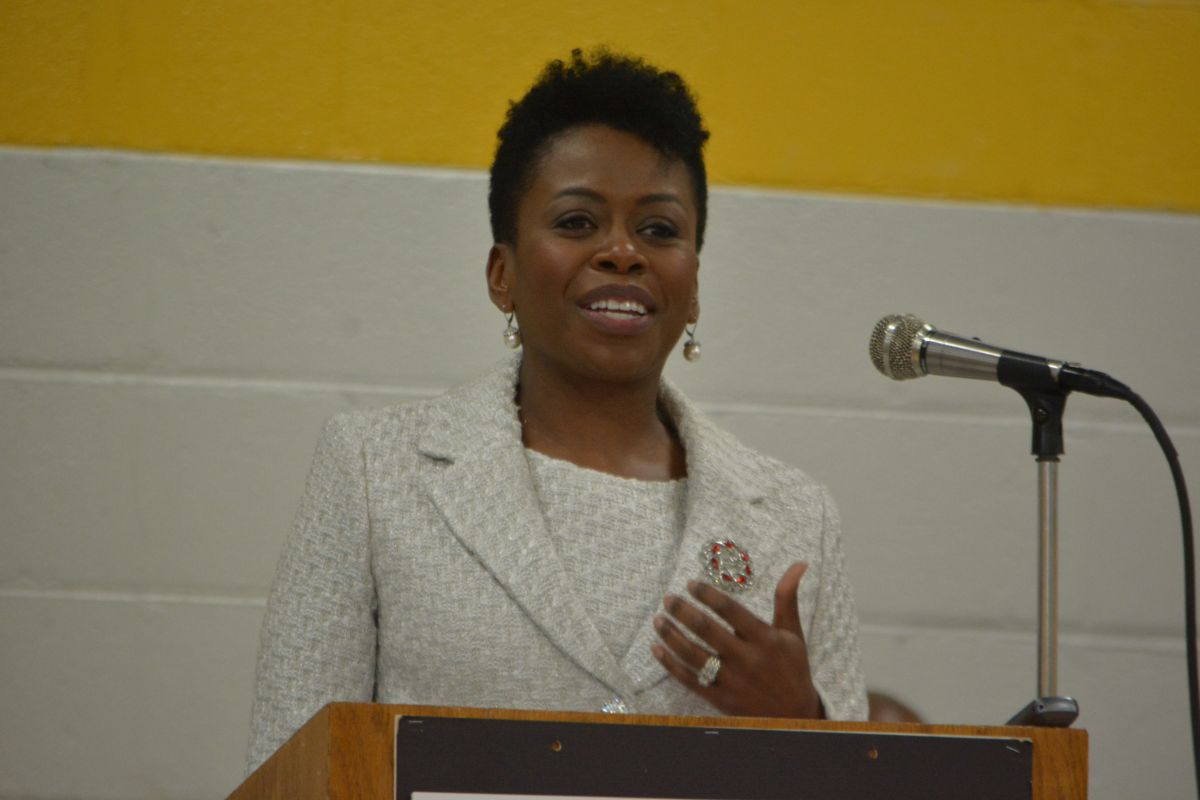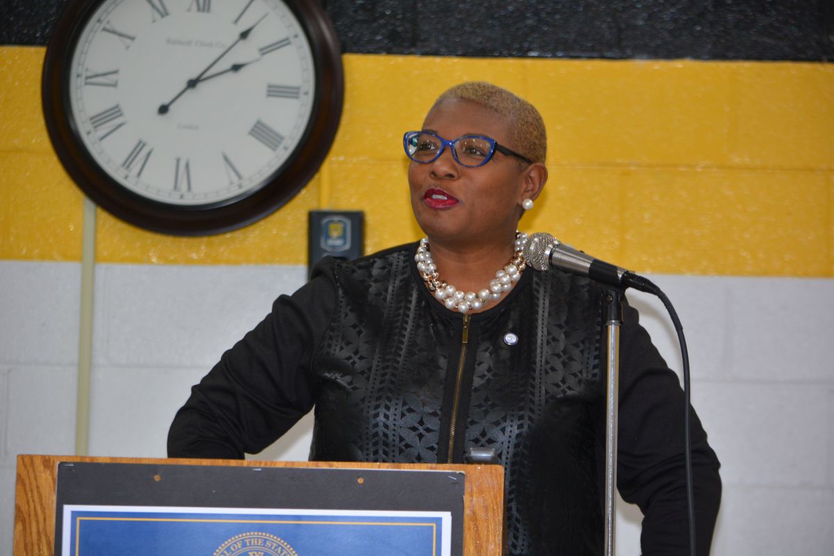 Montgomery county Trustee Kimberly Wiggins speaking at the swearing-in ceremony of Tennessee Democratic State Representative for the 67th District, Ronnie Glynn at Burt Elementary School on Dec. 10, 2022. (Lee Erwin)