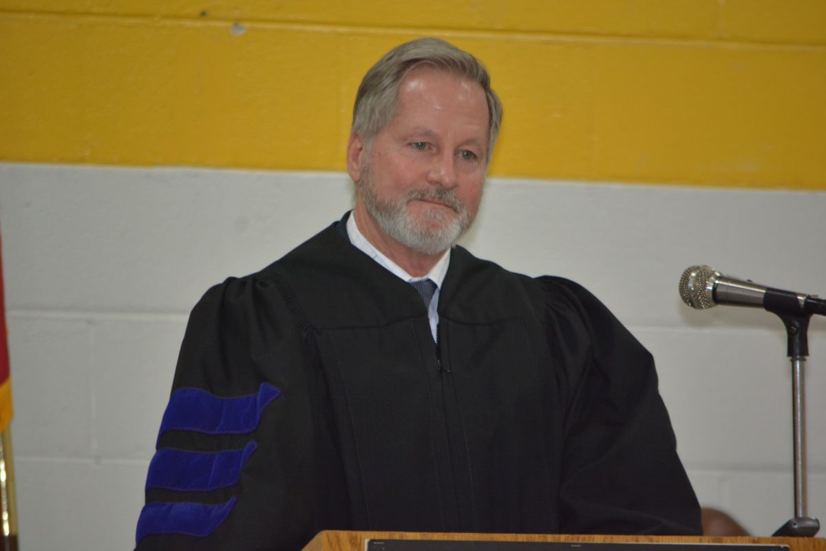 Judge Tim Barnes speaking at the swearing-in ceremony of Tennessee Democratic State Representative for the 67th District, Ronnie Glynn at Burt Elementary School on Dec. 10, 2022. (Lee Erwin)