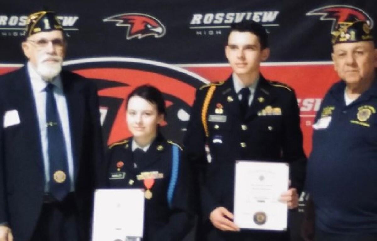 CLARKSVILLE, TN – On April 7 at Rossview High School, Post 289 2nd Vice Commander Ernest Schmidt and Post Adjutant Bob Grigsey awarded two JROTC Awards to cadets Capt. Garrison Depriest and Kamiliya Aumiller.