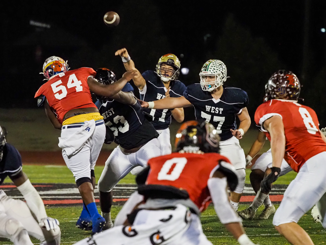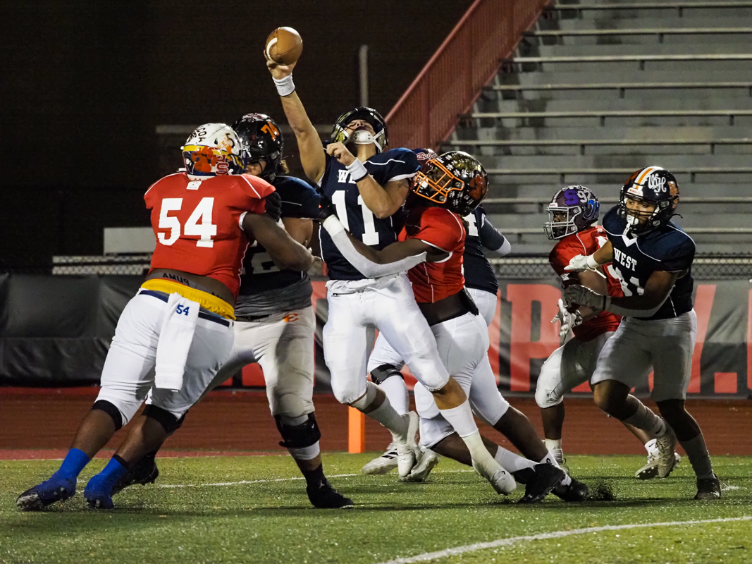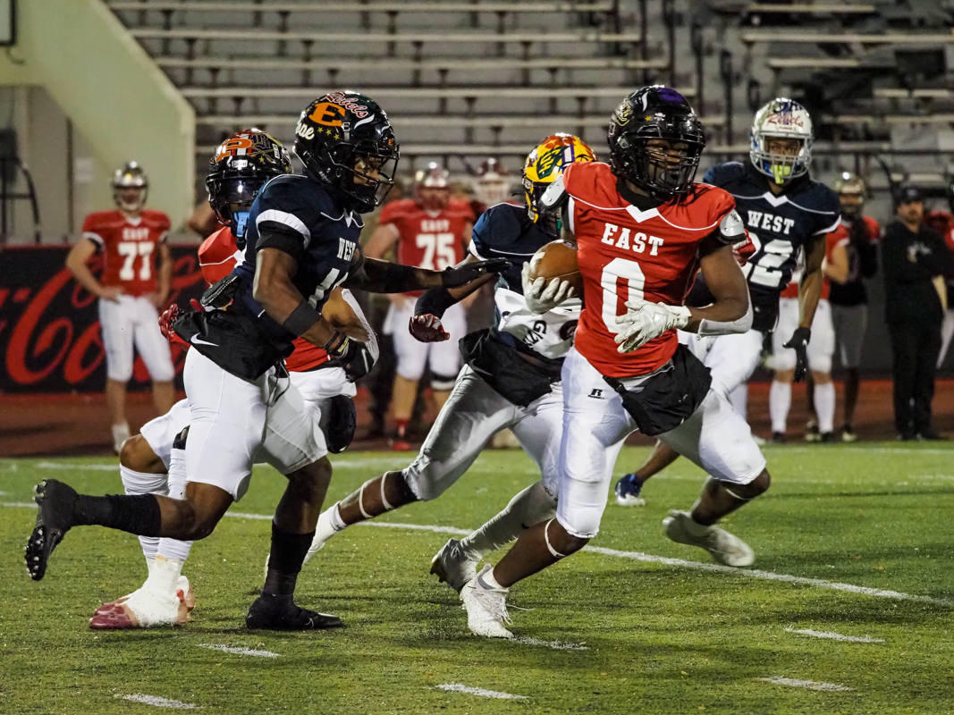 East came to play on defense, notching two sacks and a tackle for loss early in the game. This pocket penetration continued all game, keeping West’s quarterbacks on the back foot. East’s defense even scored off a huge pick six.
