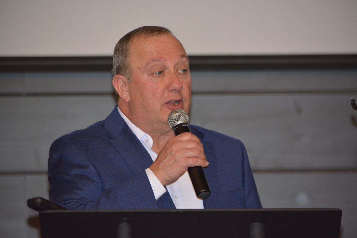 Board member Rob Selkow speaks to guests at the Soldiers and Families Embraced (SAFE) fundraising breakfast on, Thur. Mar. 10. (Lee Erwin).