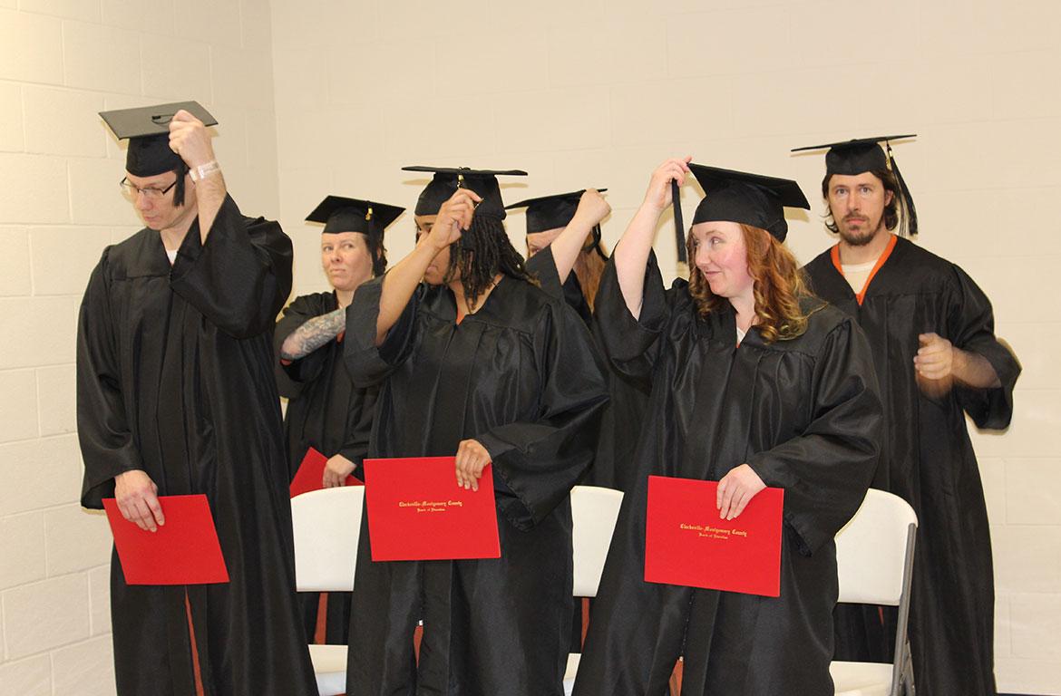 Audrey Clevenger, Kymber Green, Paul Murphy, Rachel Parson, Tabitha Kirk, and Andy Travis received their high school equivalency diplomas in a ceremony held at the jail chapel.