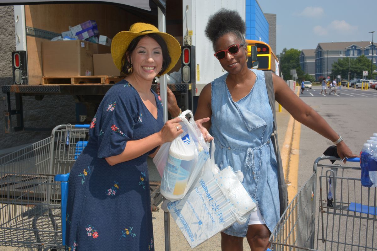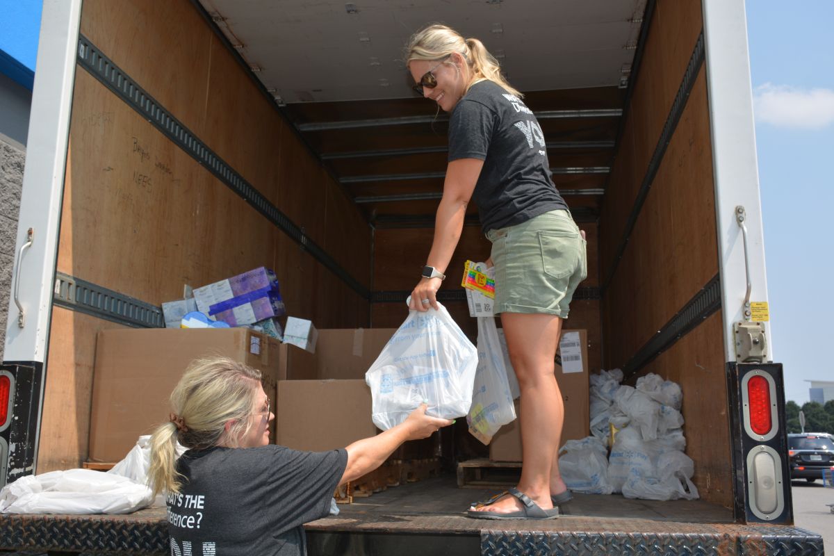 A volunteer accepts a donation of school supplies at Walmart for the Stuff the Bus event on Sat July 24 2021 (Lee Erwin).