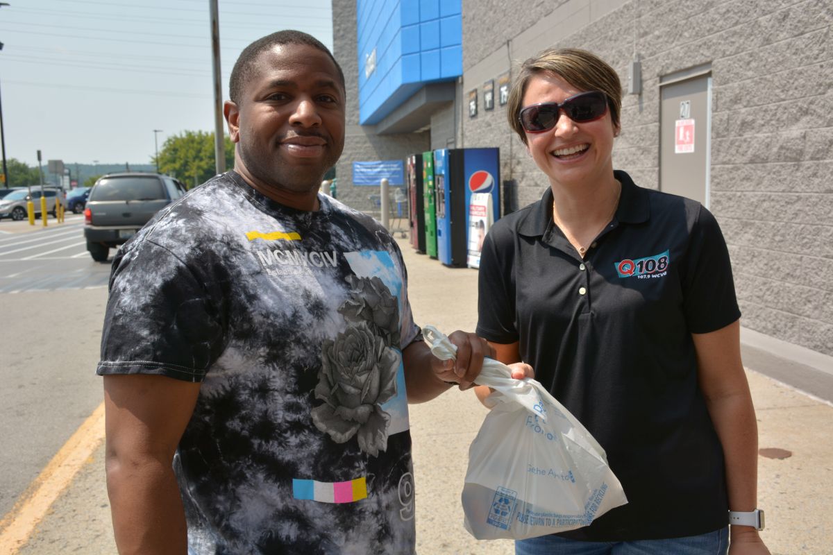 Sari, morning air personality on Q108 accepts a donation of school supplies from a shopper at Walmart for Stuff the Bus on Sat July 24 2021 (Lee Erwin).