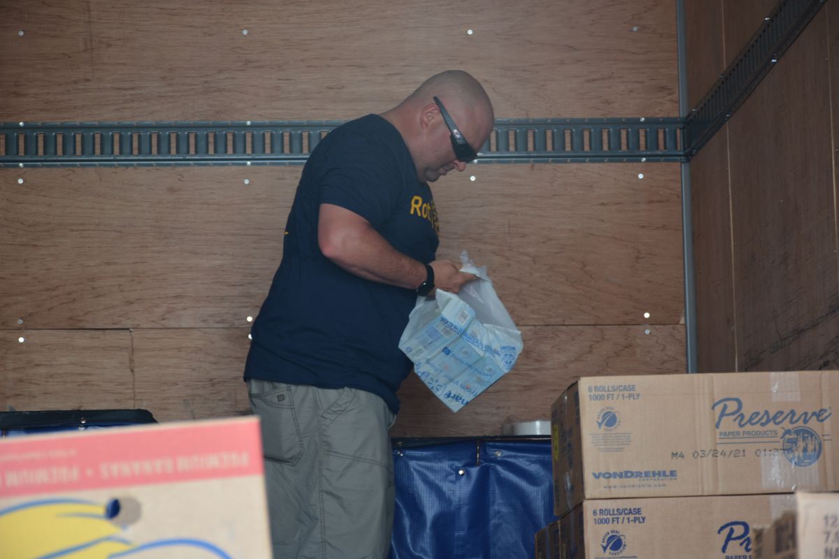A volunteer sorts donations of school supplies at Walmart for the Stuff the Bus event on Sat July 24 2021 (Lee Erwin).